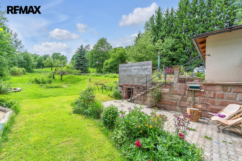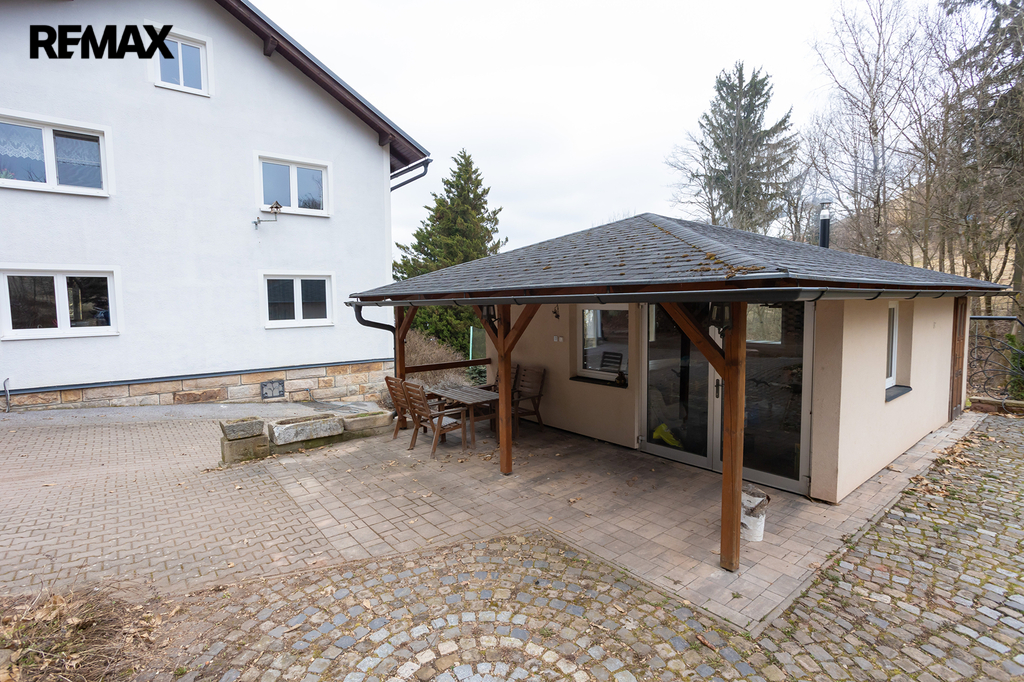Vynikající zázemí: K dispozici je zděný altán, garáž, dlážděné parkoviště pro 4 auta a dalších až 8 míst na travnaté ploše u domu, a rozlehlá zahrada.