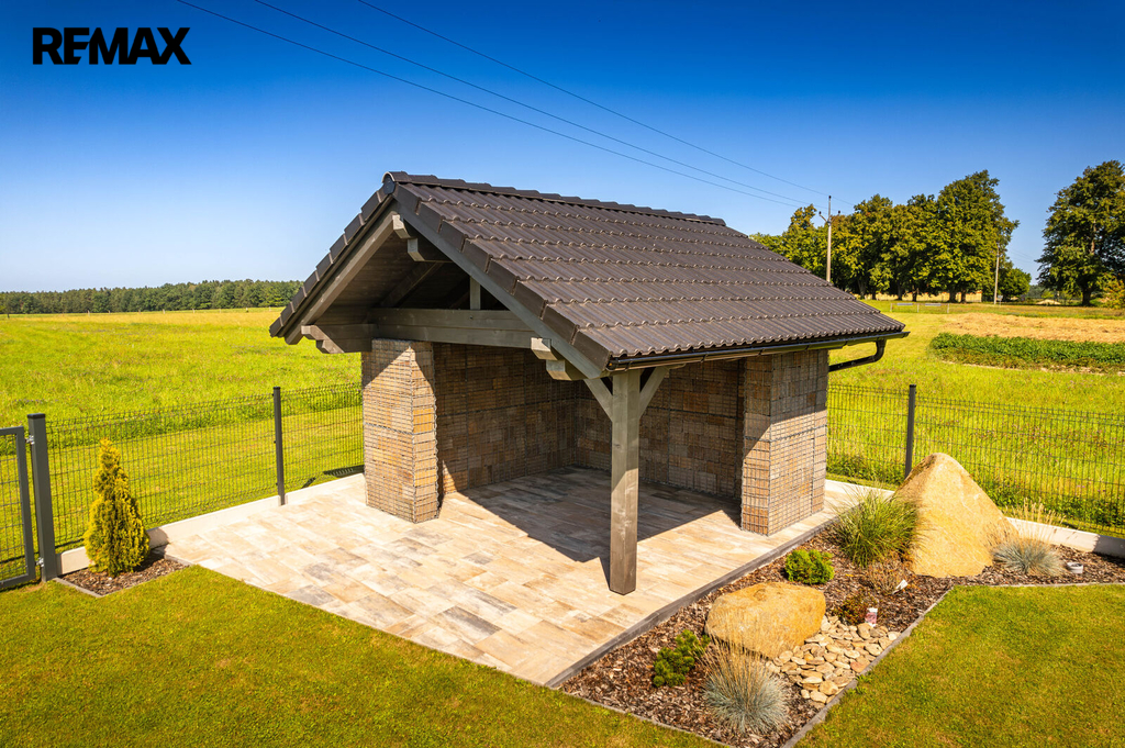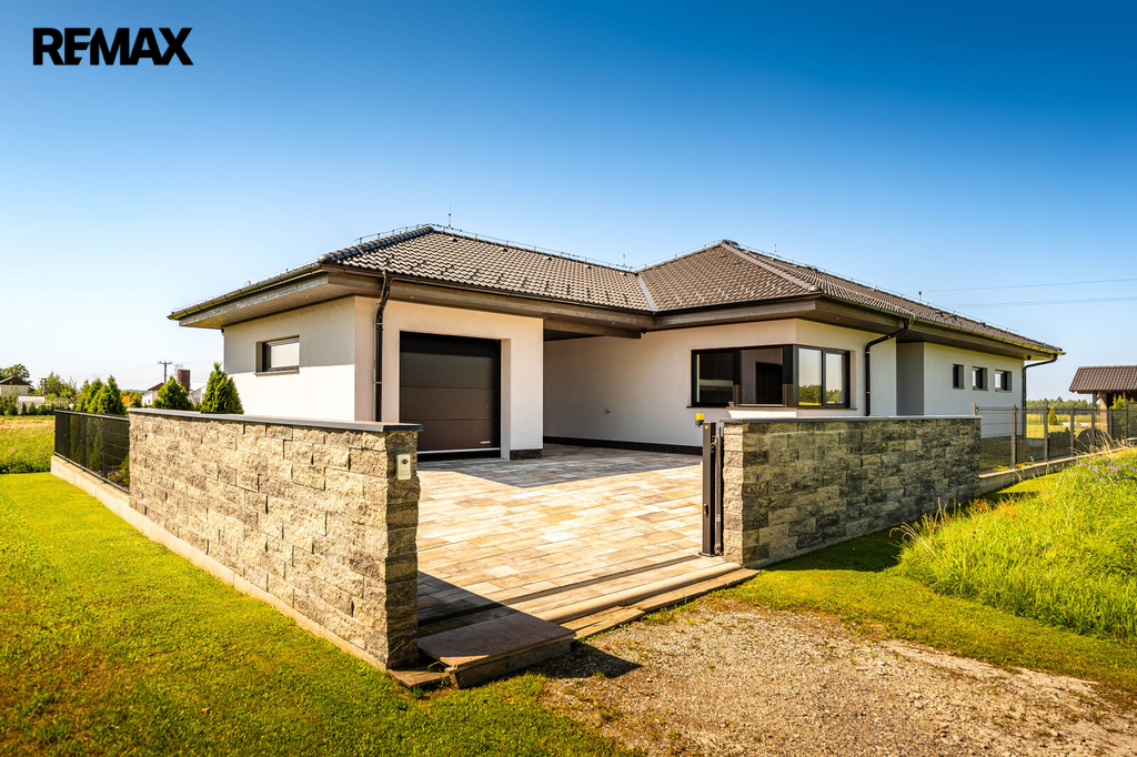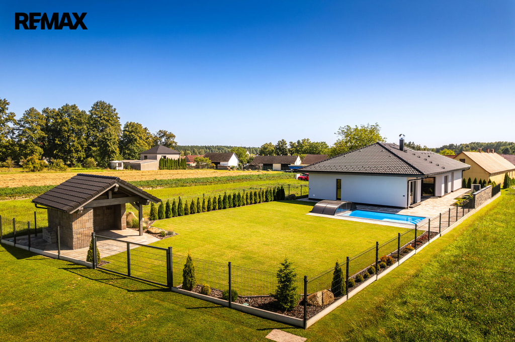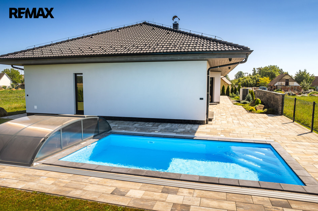 Součástí pozemku o celkové výměře 912 m2 je samostatný, nepodsklepený rodinný dům typu bungalov se samostatnou garáží se skladem o celkové zastavěné ploše 192 m2. Prostor mezi garáží a domem je zastřešen a vznikl zde tak prostor pro parkování dalšího vozu. Součástí nemovitosti je také zastřešená pergola umístěná v zadní části zahrady a krytý venkovní bazén navazující na vydlážděnou terasu obklopující celý dům.