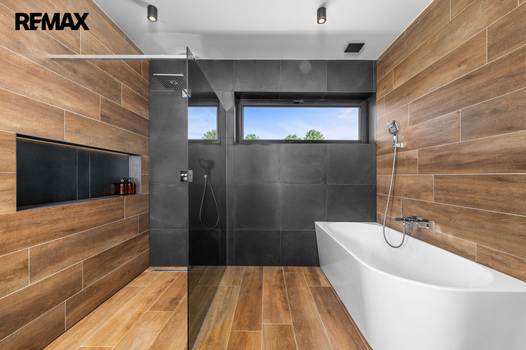Na oknech v obývacím pokoji a ložnici jsou předokenní žaluzie, podlahové krytiny tvoří lepený vinyl a dlažba, dům má zabezpečovací systém. Postaven je z cihelných bloků Porotherm 44 cm, vybaven kvalitními dřevěnými dveřmi i okny (trojsklo). Vytápění je řešené ústředními, podlahovými rozvody, zdrojem je tepelné čerpadlo vzduch-voda. V obývacím pokoji jsou krbová kamna, která jsou obsluhována z technické místnosti. Ohřev vody zajišťuje 300 l kombinovaný bojler (tepelné čerpadlo a elektřina). Objekt je napojený na obecní přípojku vodovodního řadu, kanalizace je řešena vlastní čistírnou odpadních vod s přepadem do kanalizace. Dešťová voda je svedena do dvou retenčních nádrží, ze kterých je následně řešena závlaha zahrady.