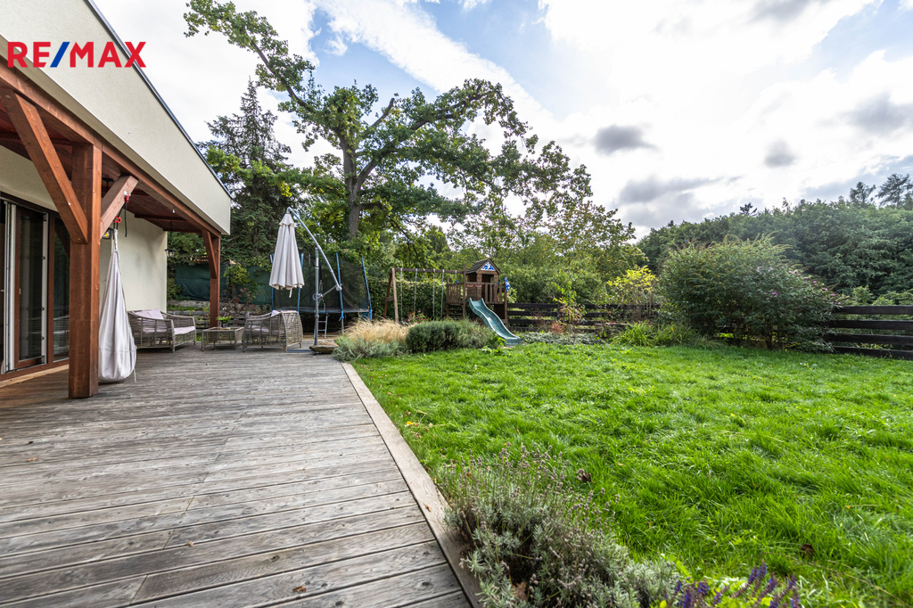 Celková plocha pozemku činí 1 160 m². Zahrada poskytuje dostatek soukromí, terasu pro posezení, je zde dětské hřiště, vzrostlé stromy a mnoho útulných zákoutí. Na pozemku je dostatek místa pro parkování několika aut.