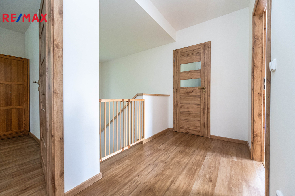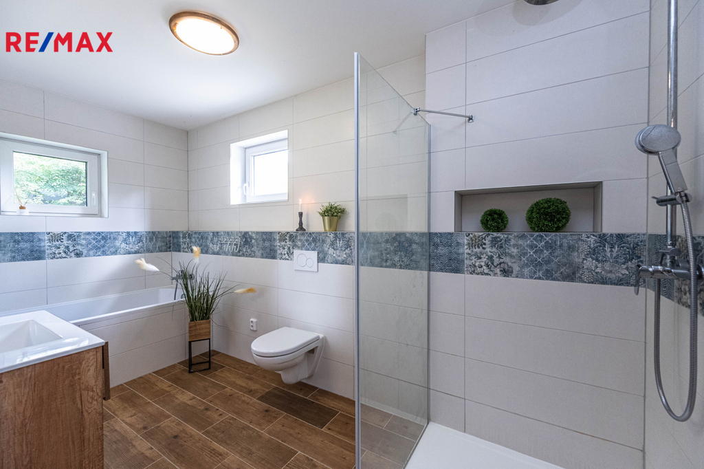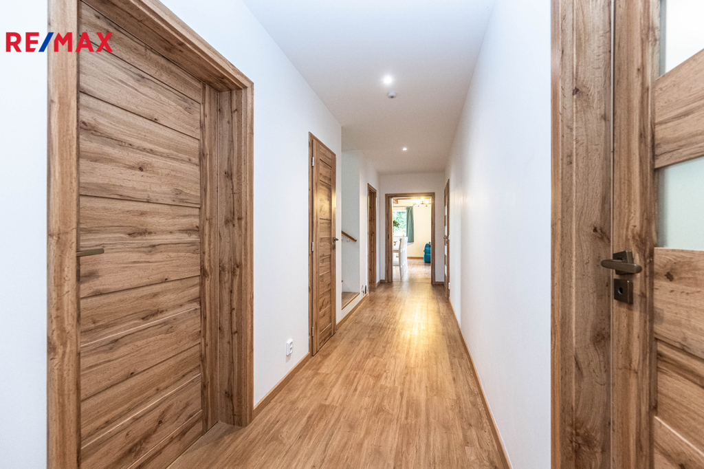 Interiér domu kombinuje kvalitní materiály, vkusné zařízení a praktické řešení – dřevěné stropy, designové koupelny, prostorné úložné prostory a vestavěné šatny.