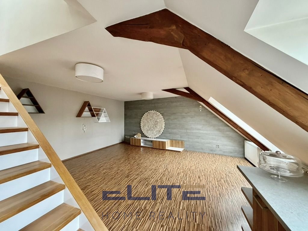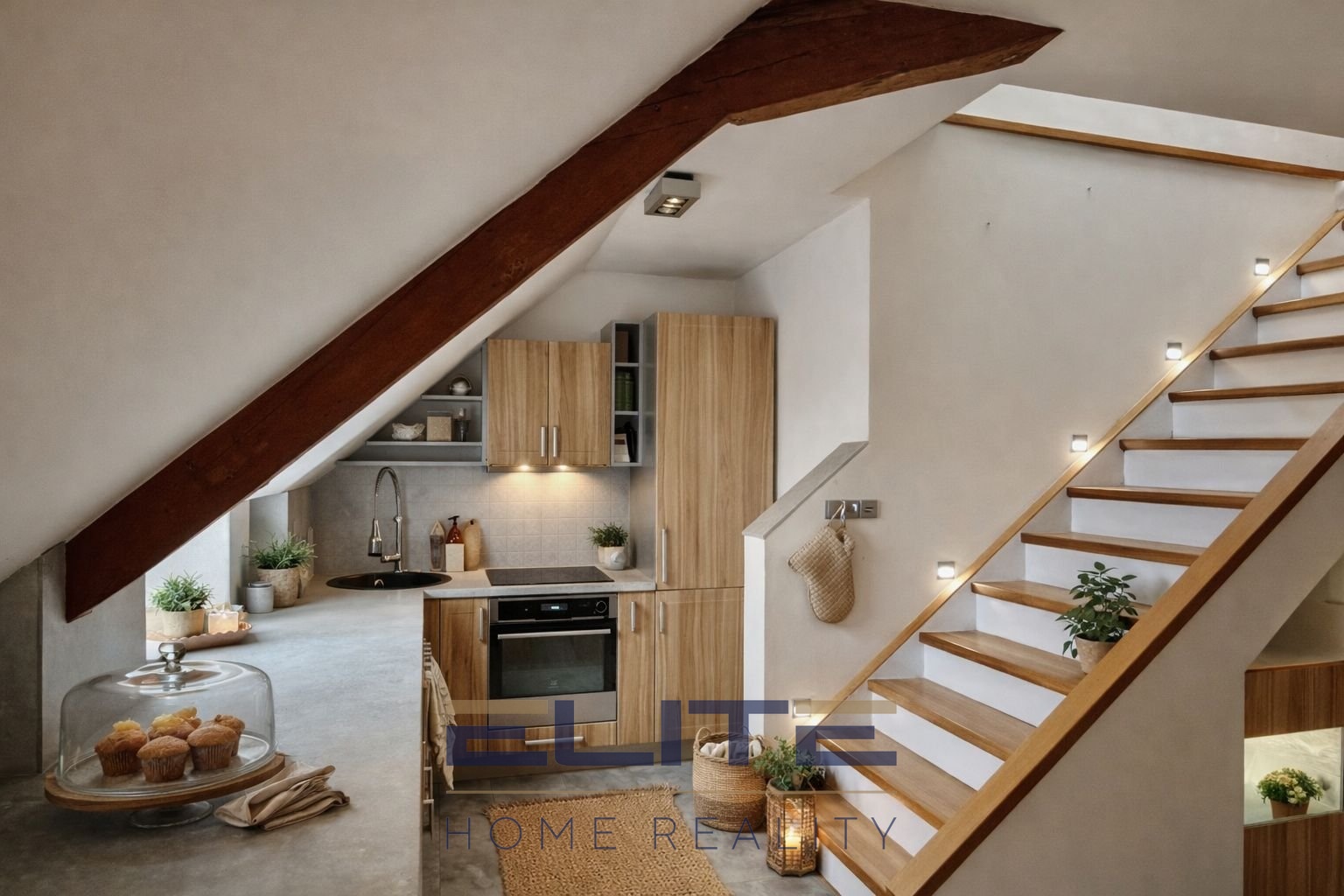 Dispozičně byt sestává ze vstupní chodby s vestavěnými skříněmi, prostorného obývacího pokoje s kuchyňským koutem a velkorysé koupelny s rohovou vanou a WC. Dominantou interiéru jsou masivní dubové schody, které vedou do mezonetové části bytu.