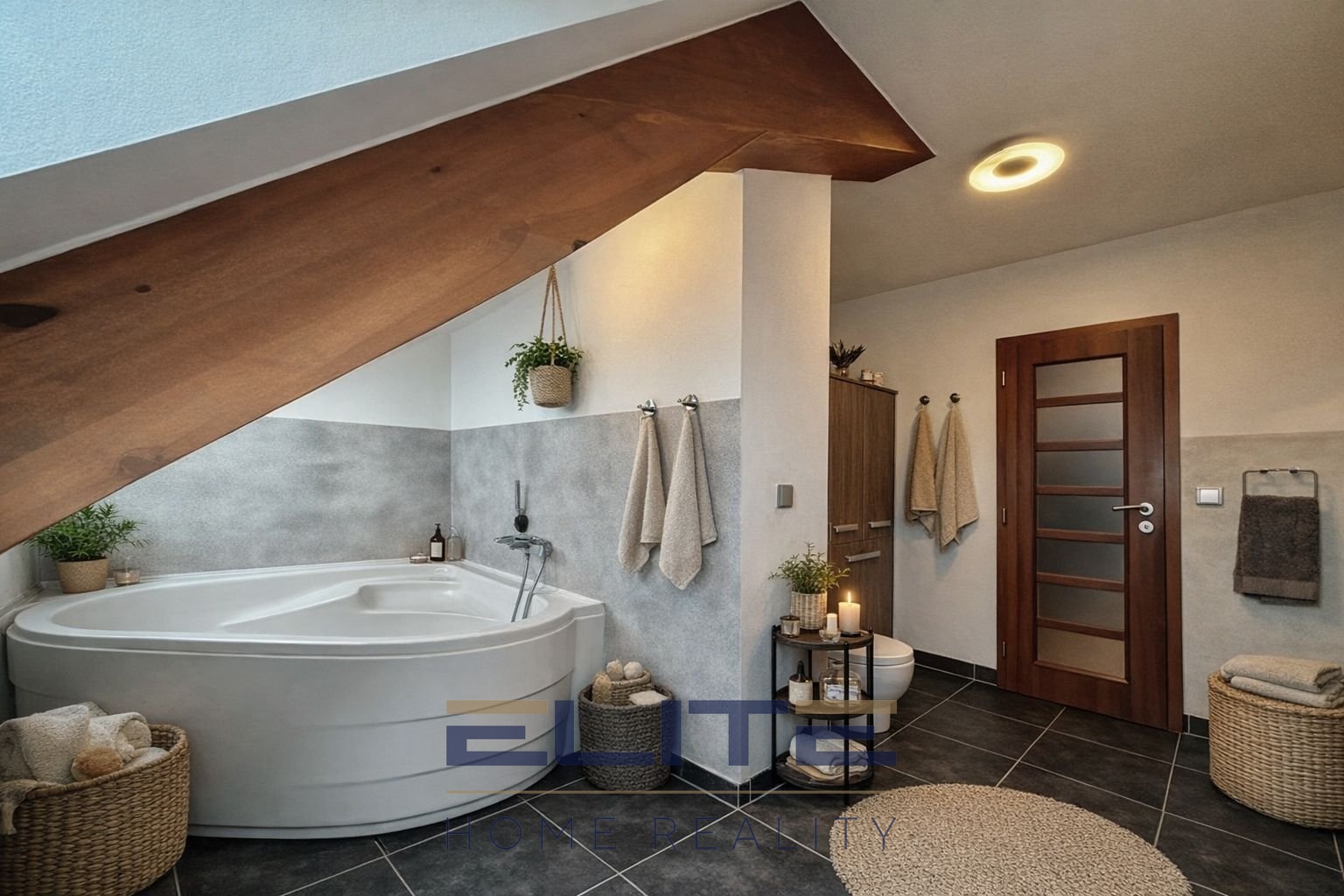V obytných místnostech jsou plovoucí podlahy, v celém bytě dřevěné obložkové dveře, samozřejmostí jsou bezpečnostní vstupní dveře. Koupelna je vybavena WC systémem Geberit a vkusným nábytkem na míru, ve kterém je umístěn/skryt plynový kotel Viessmann, zajišťující vytápění i ohřev teplé vody. Všechna okna jsou značky Velux, která zajišťují dostatek denního světla. V koupelně prakticky plastová, v obytných částech dřevěná.