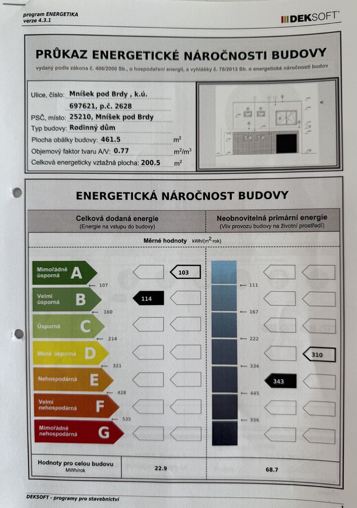 - Ukazatel energetické náročnosti budovy: 114 kWh/m²