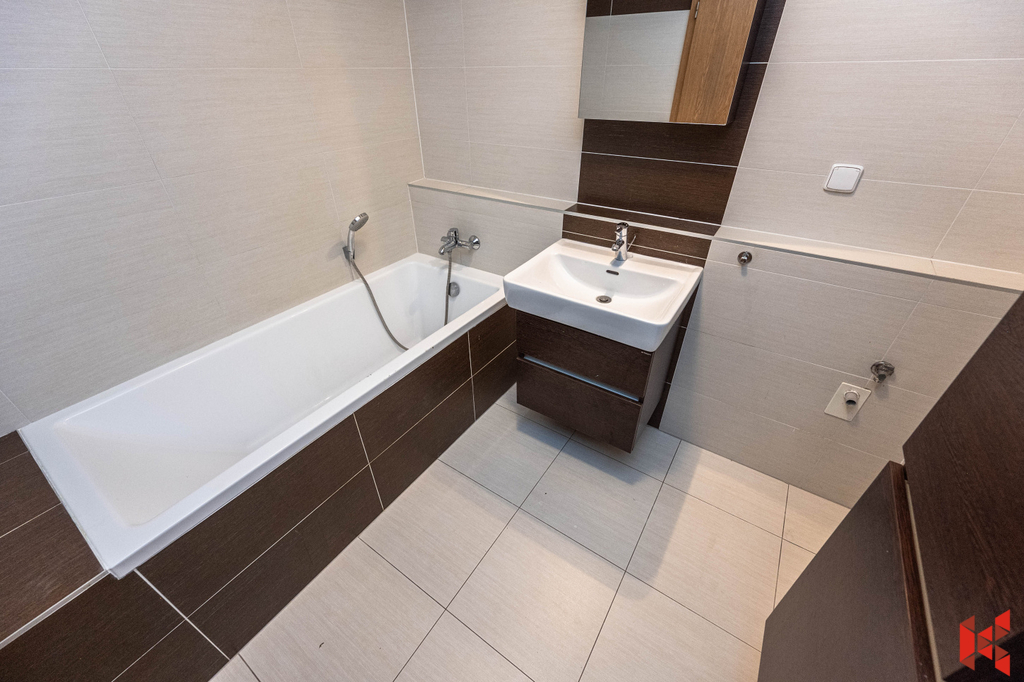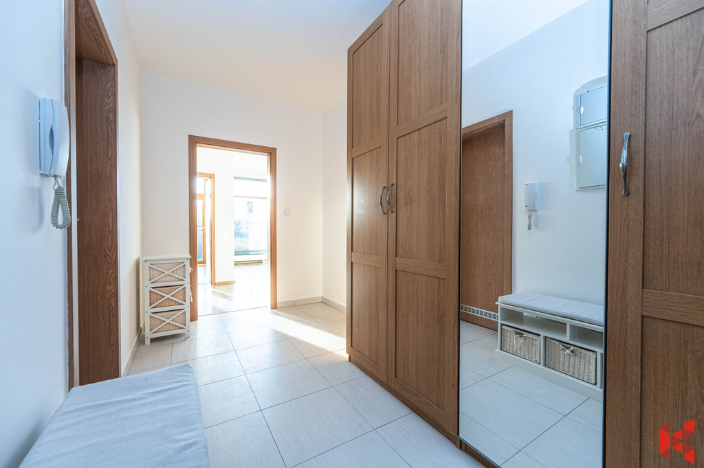 Byt vám bude naprosto vyhovovat svojí sympatickou dispozicí. Ze vstupní chodby vybavené vestavěnou skříní se dostanete doprava do ložnice, rovně do obývacího pokoje se vstupem na terasu a kuchyňským koutem, na který navazuje další pokoj. Kuchyň je umístěna v prostorném obývacím pokoji, zároveň je kompletně vybavena vestavěnými spotřebiči. Z chodby je dále přístup do koupelny s vanou a na toaletu. K bytu náleží na stejném patře komora.
