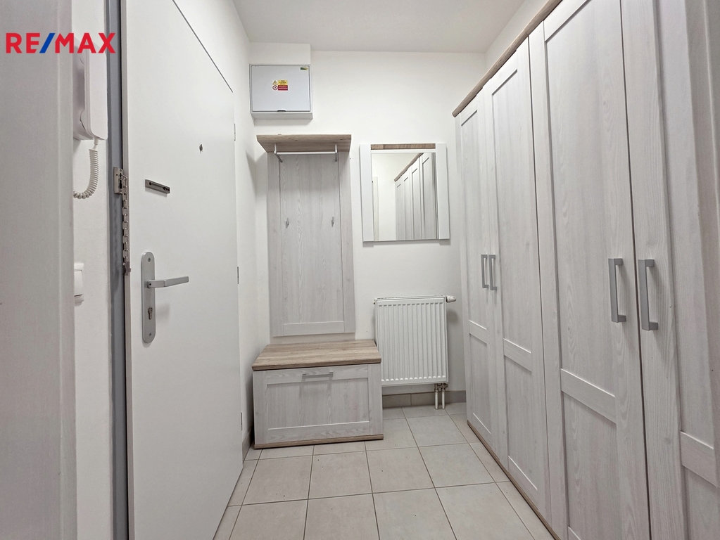 Kuchyňská linka je vybavena varnou deskou, troubou, digestoří, myčkou a menší lednicí s mrazákem. V předsíni je skříň, věšák a botník.