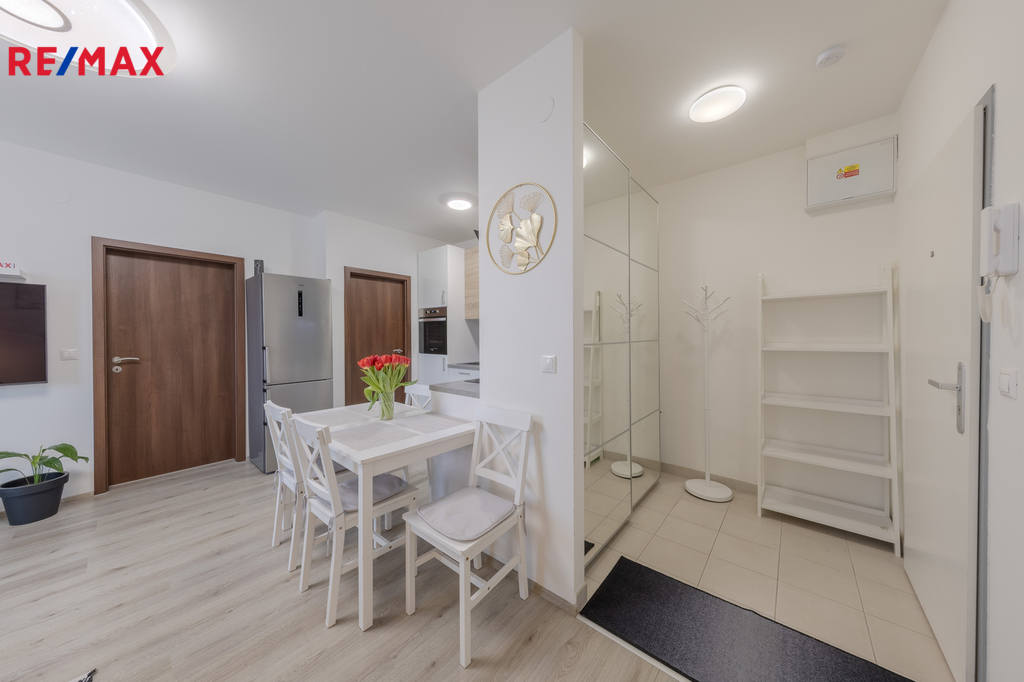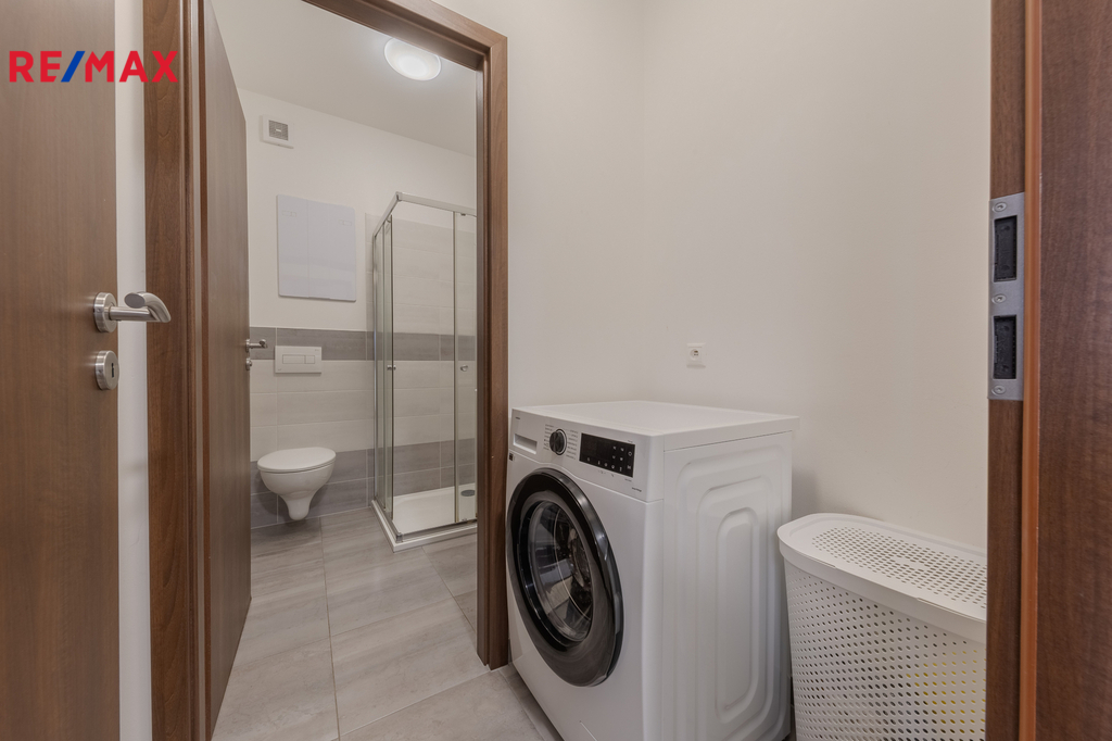 Kuchyňská linka je vybavena indukční varnou deskou, elektrickou troubou, digestoří a myčkou. V chodbě je velkorysá šatní vestavěná skříň. Koupelna s WC je vybavena sprchovým koutem a v samostatné místnosti je místo pro pračku a sušičku.