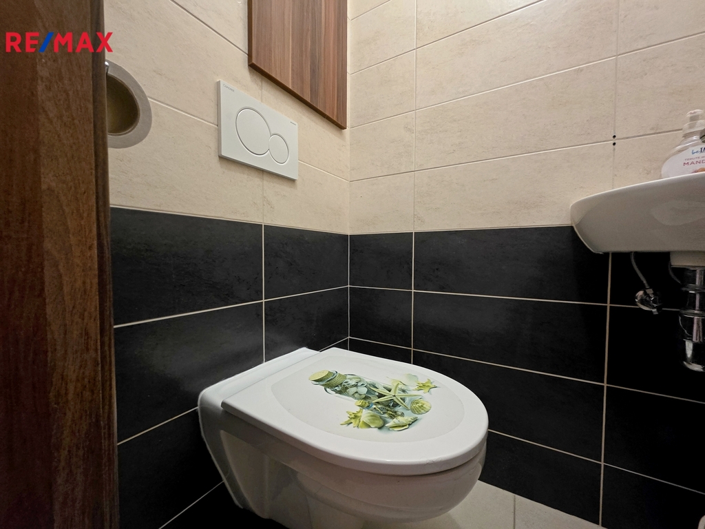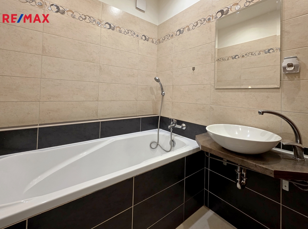 V koupelně je vana, umyvadlo a pračka s horním plněním. Samostatné WC je přístupné z chodby za vstupními dveřmi.