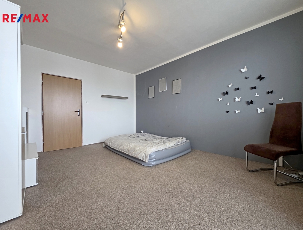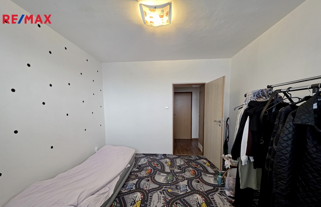 V obývacím pokoji zůstává obývací stěna, na chodbě šatní skříň a za posuvnými dveřmi je prostorná komora. Na balkoně je posezení pro dva.