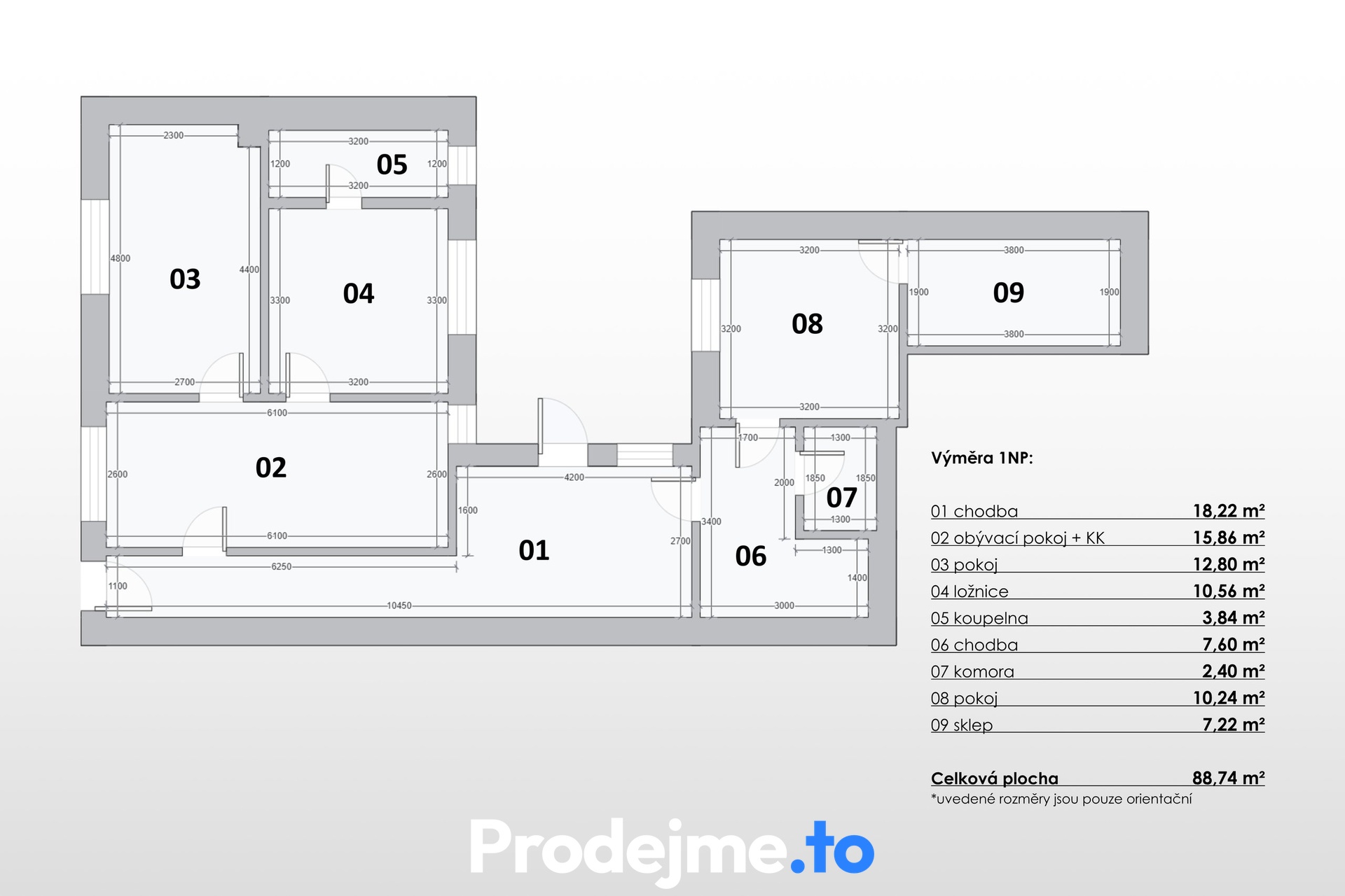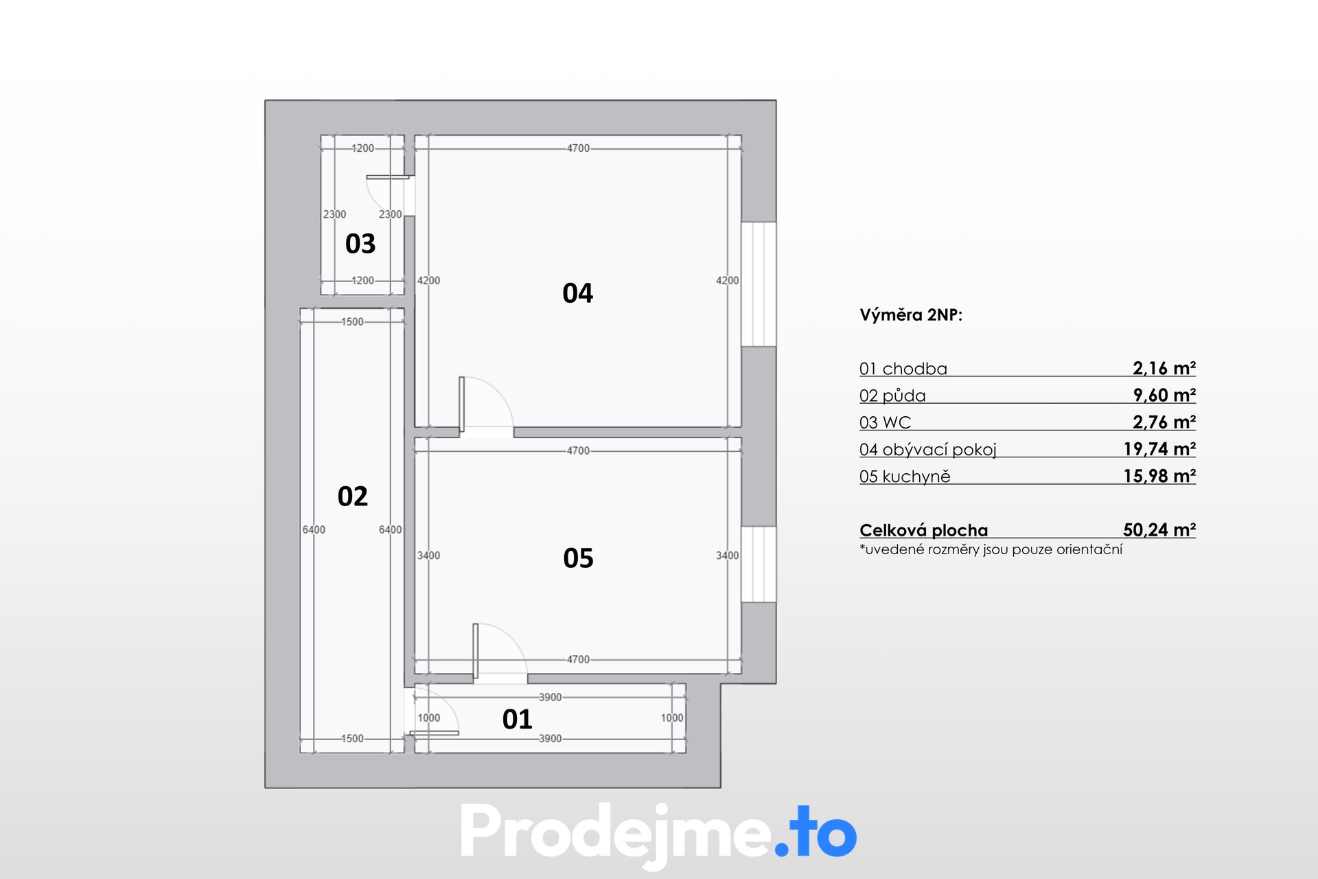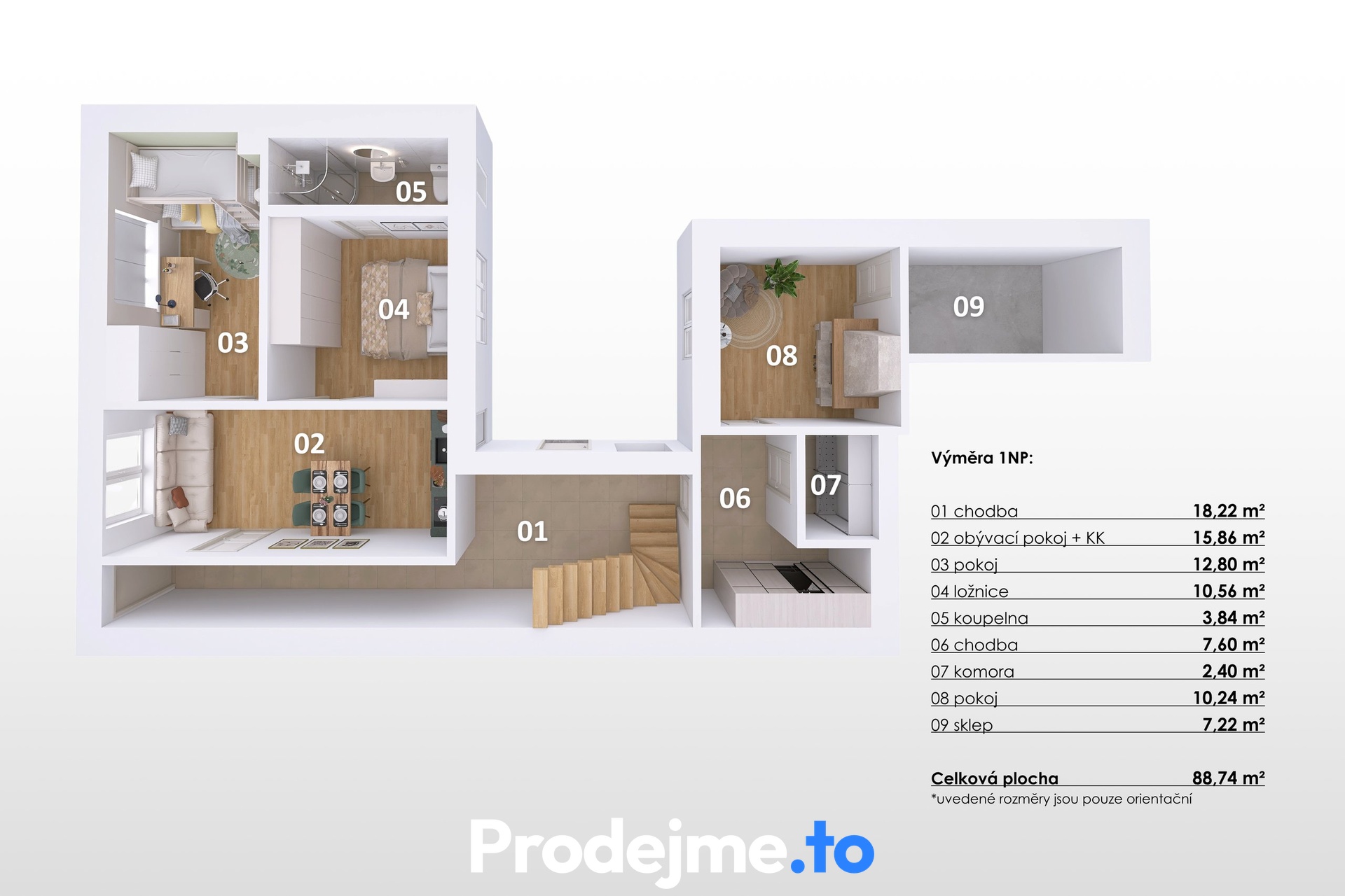 Jednotka v patře: Sestává z obývacího pokoje s kuchyňským koutem, ložnice a samostatné toalety, kterou lze snadno rozšířit o sprchový kout. Tyto prostory navíc přímo sousedí s půdou, což otevírá cestu k dalšímu rozšíření o nové obytné místnosti.