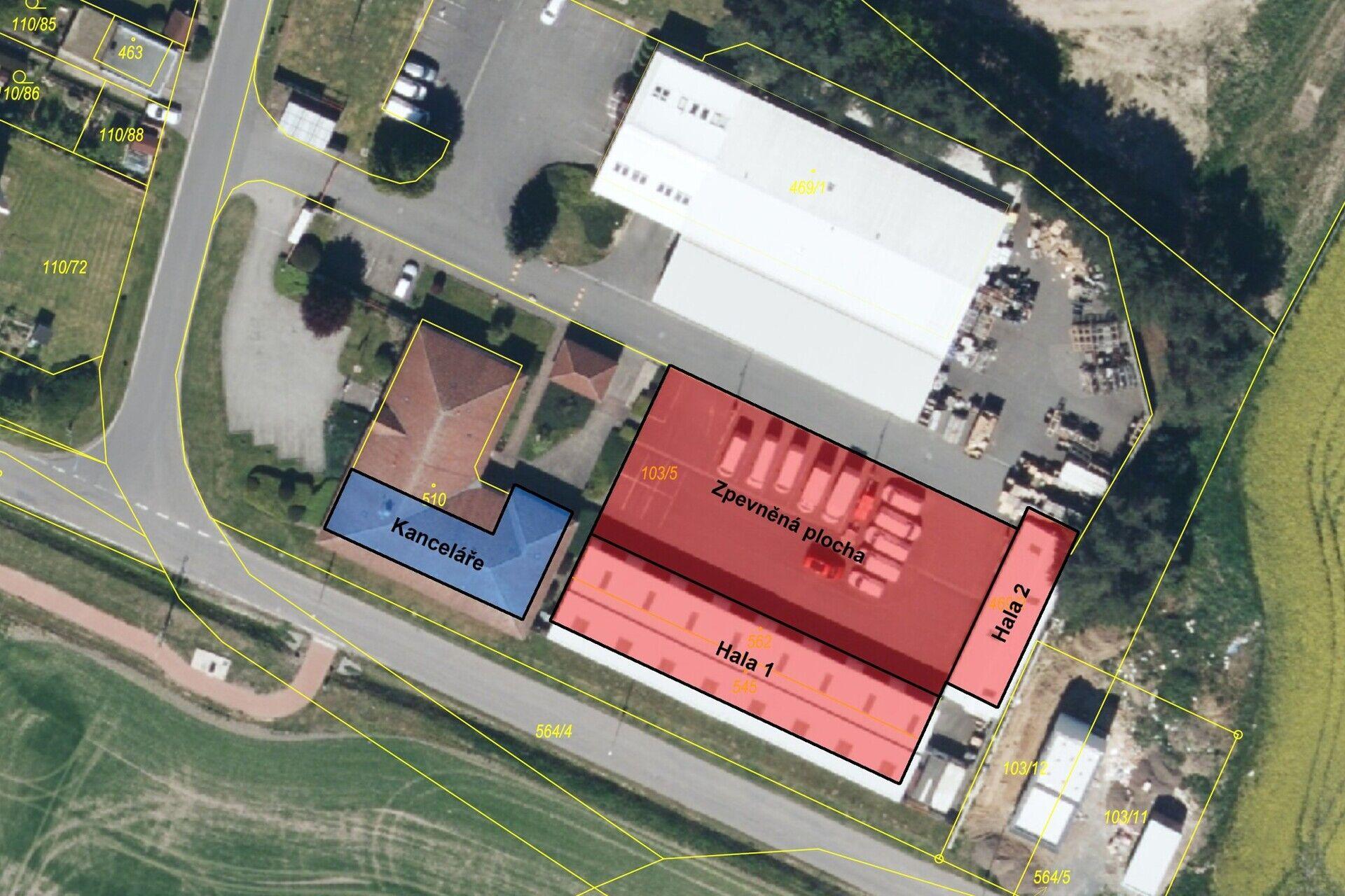 Poznámka: Ke kancelářím je možno pronajmout i přilehlé nezateplené skladovací haly o zastavěné ploše o výměrách 602 m2 a 174 m2 a zpevněnou asfaltovou plochu cca 1.100 m2 vhodnou pro venkovní skladování nebo parkování vozidel.