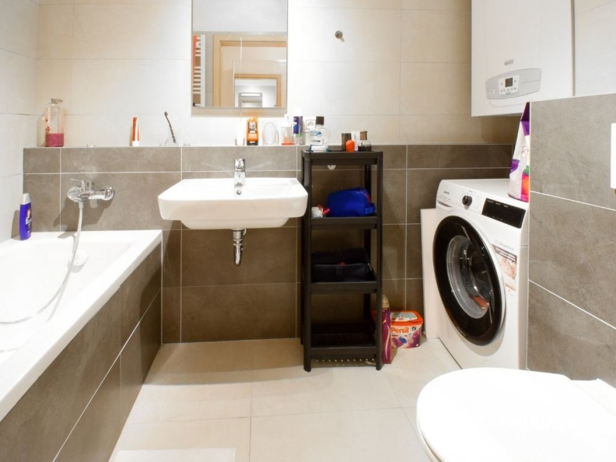 Byt se nabízí částečně vybavený. Kuchyňský kout disponuje linkou a spotřebiči - lednice s mrazákem, sporák s el. troubou a digestoř. Koupelna je vybavena vanou, toaletou a umyvadlem.