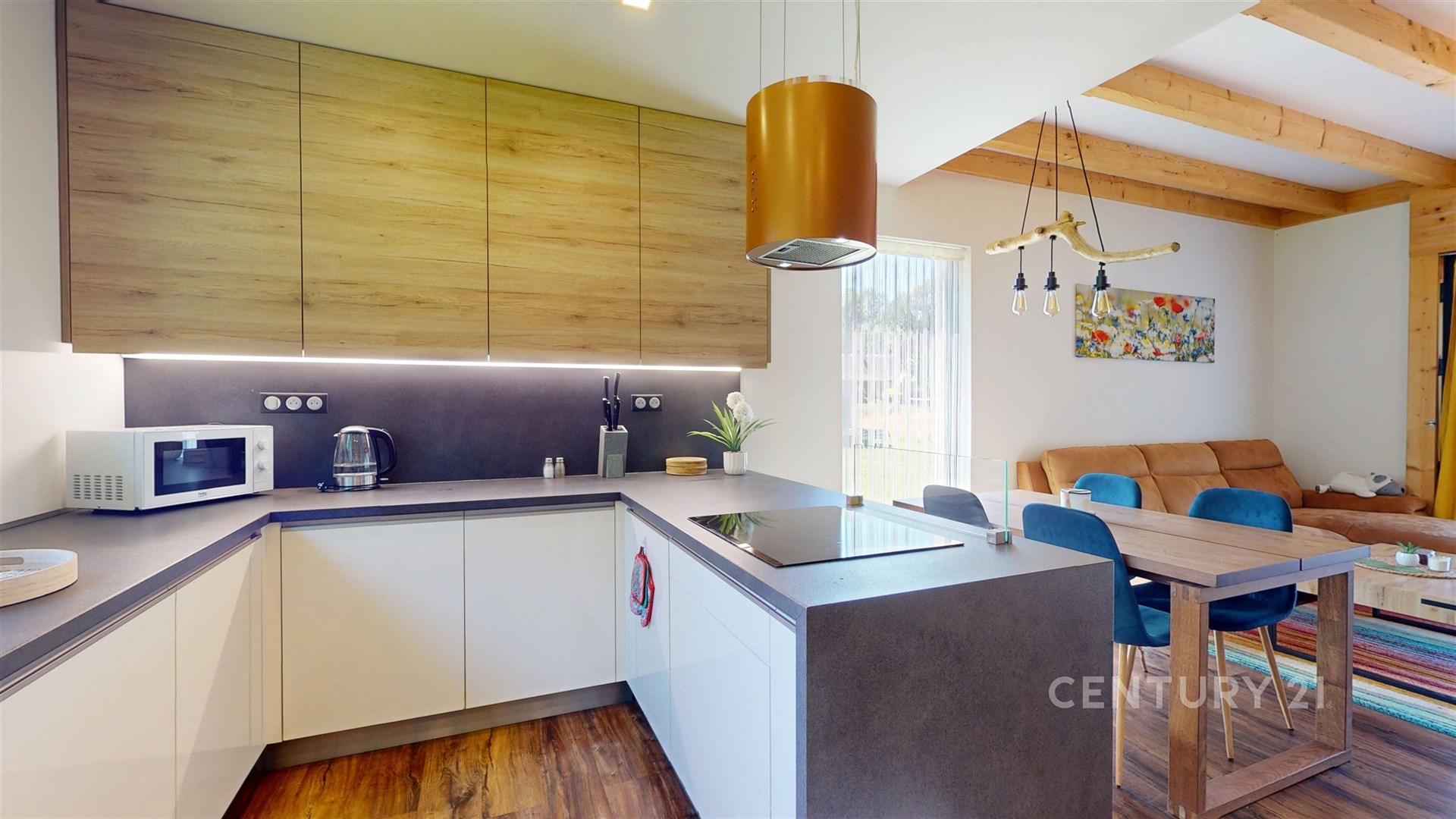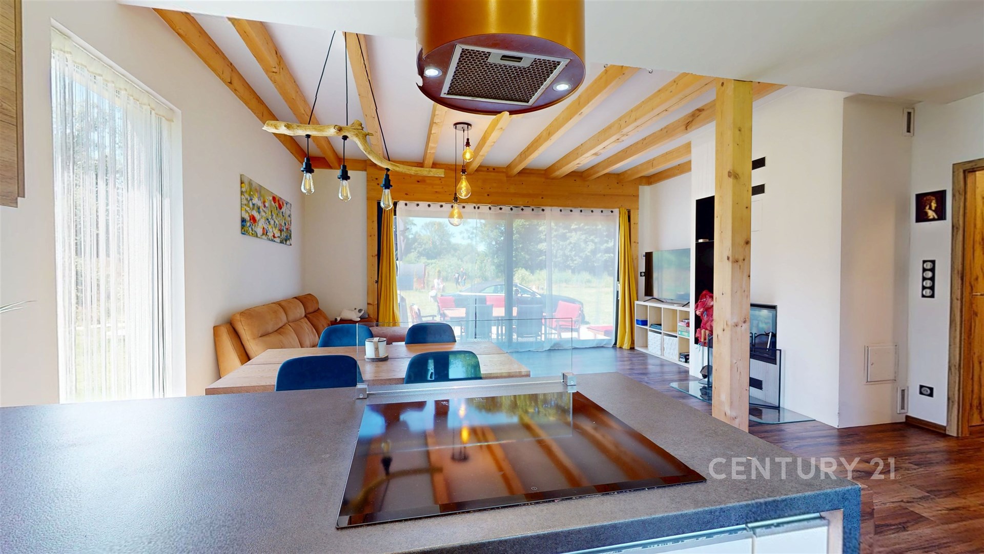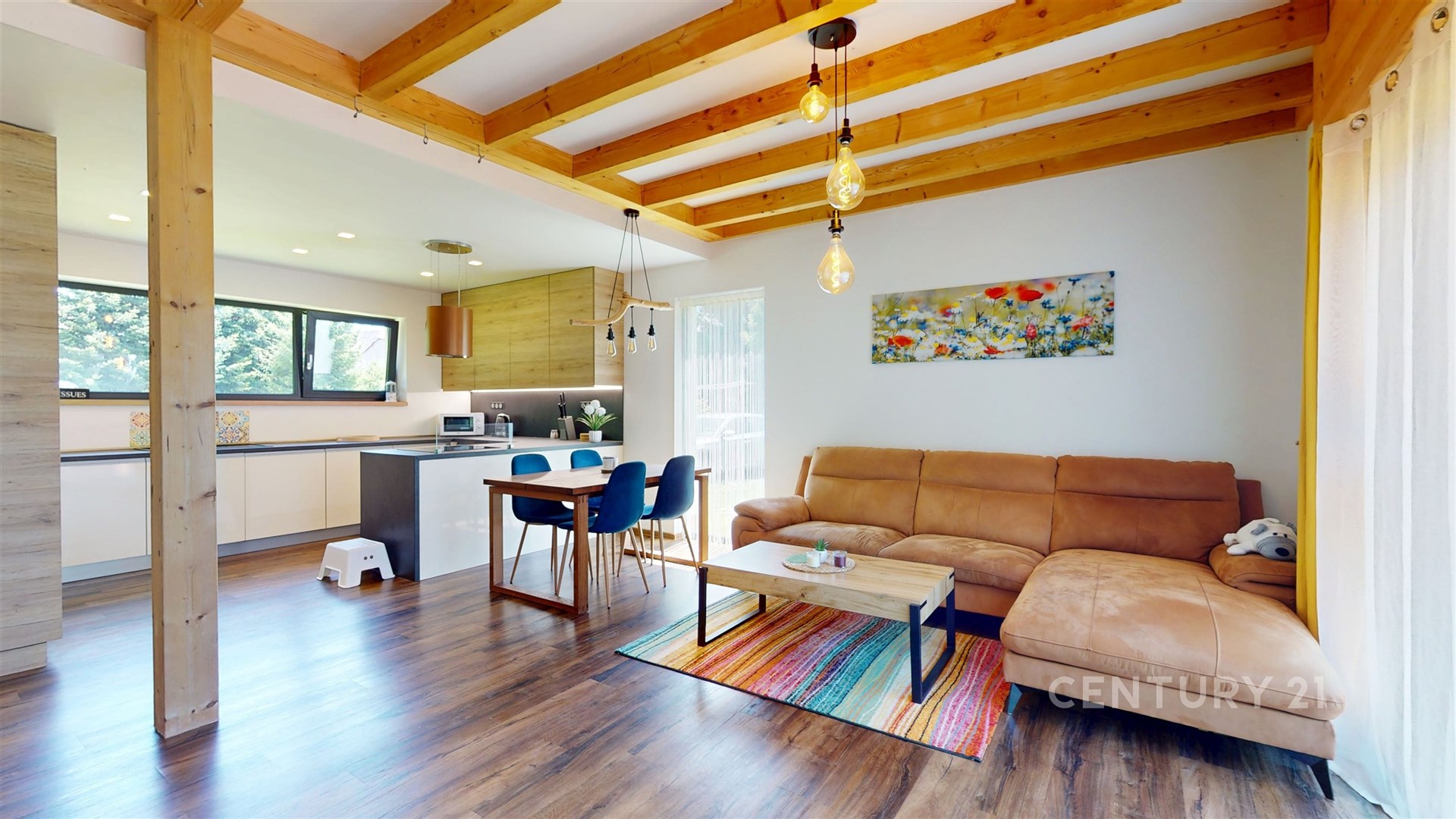 V přízemí vás přivítá velkorysý obývací pokoj propojený s kuchyní.