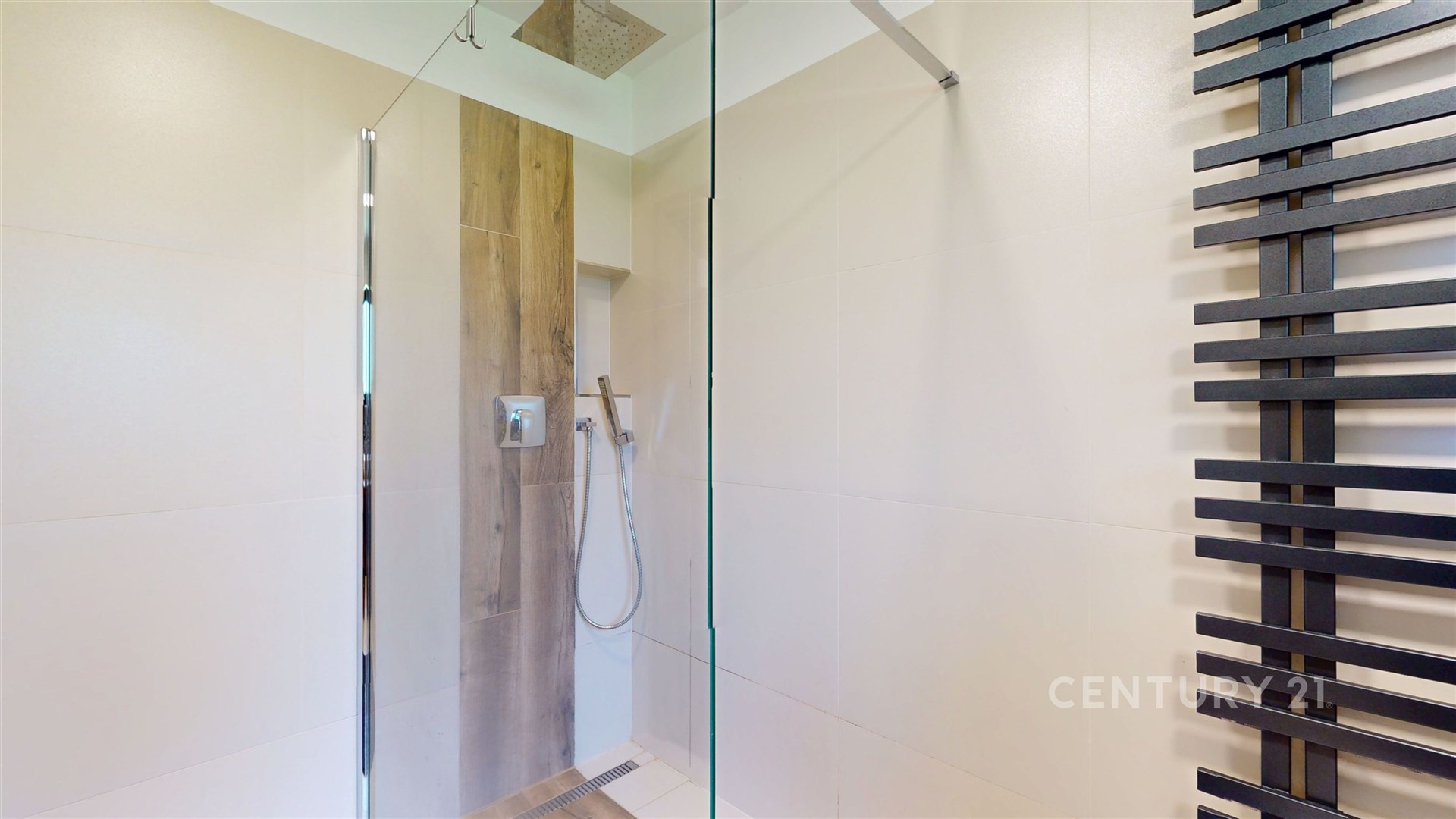Hned vedle je krásná koupelna s walkin sprchovým koutem a toaletou. Celá je dekorována bambusovým dřevem, které prostoru dodává přírodní charakter.