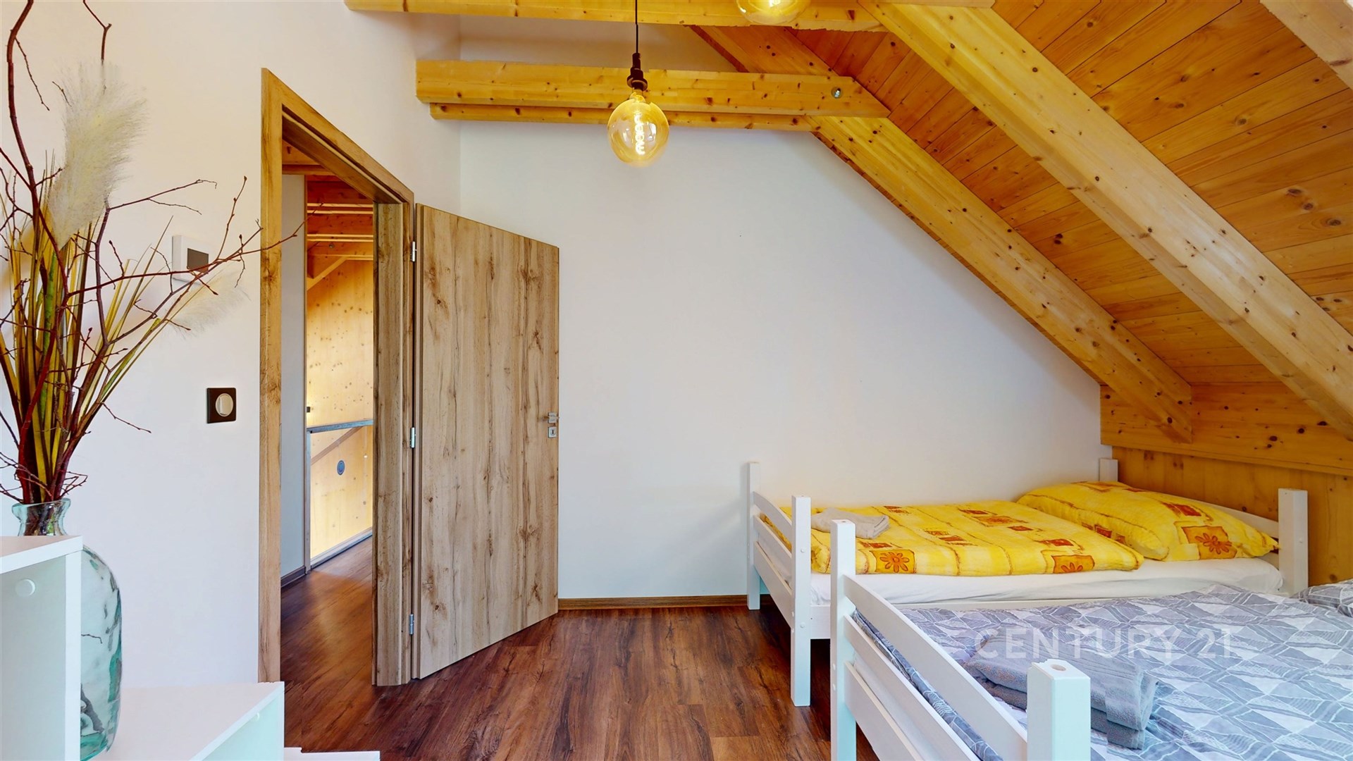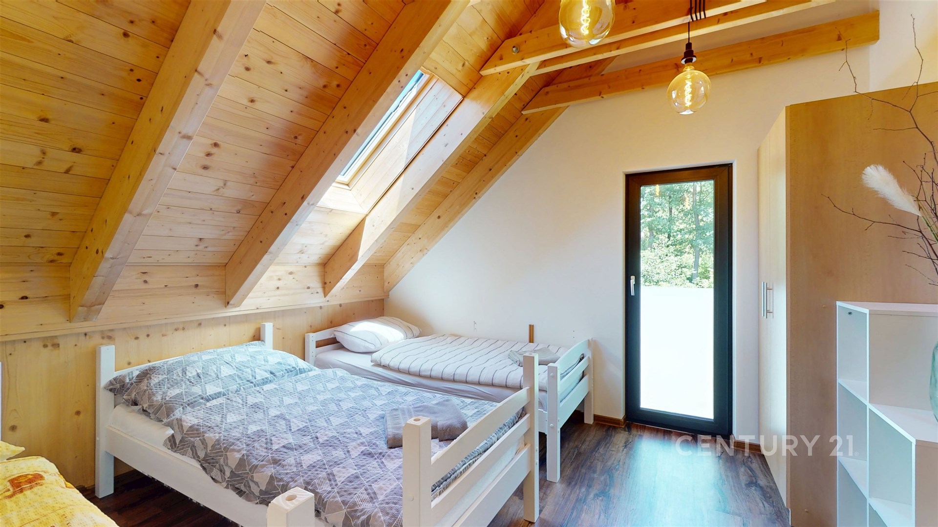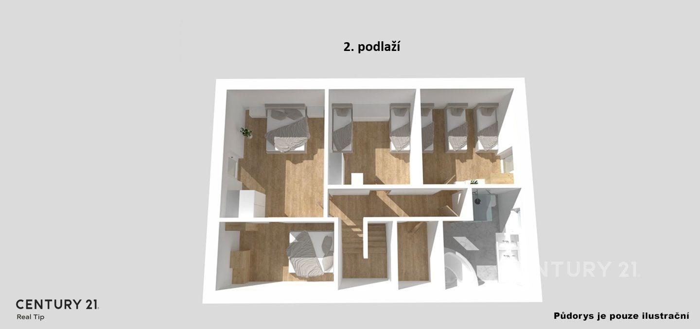 Dřevěné schodiště vás zavede do patra, kde jsou čtyři pokoje, koupelna a úklidová místnost.