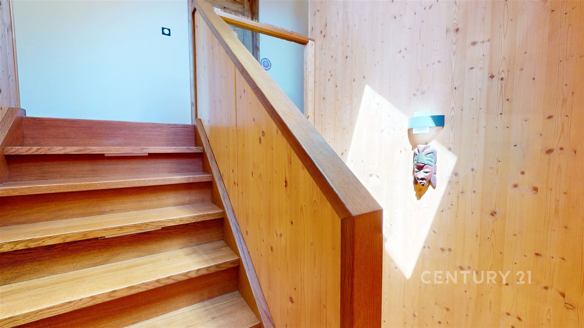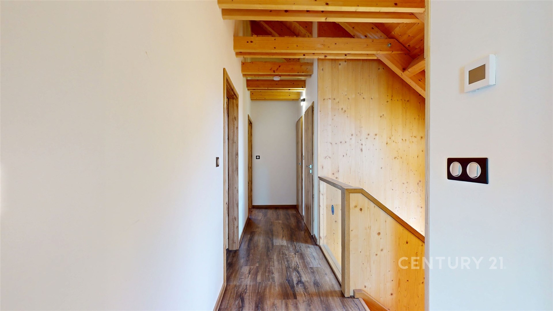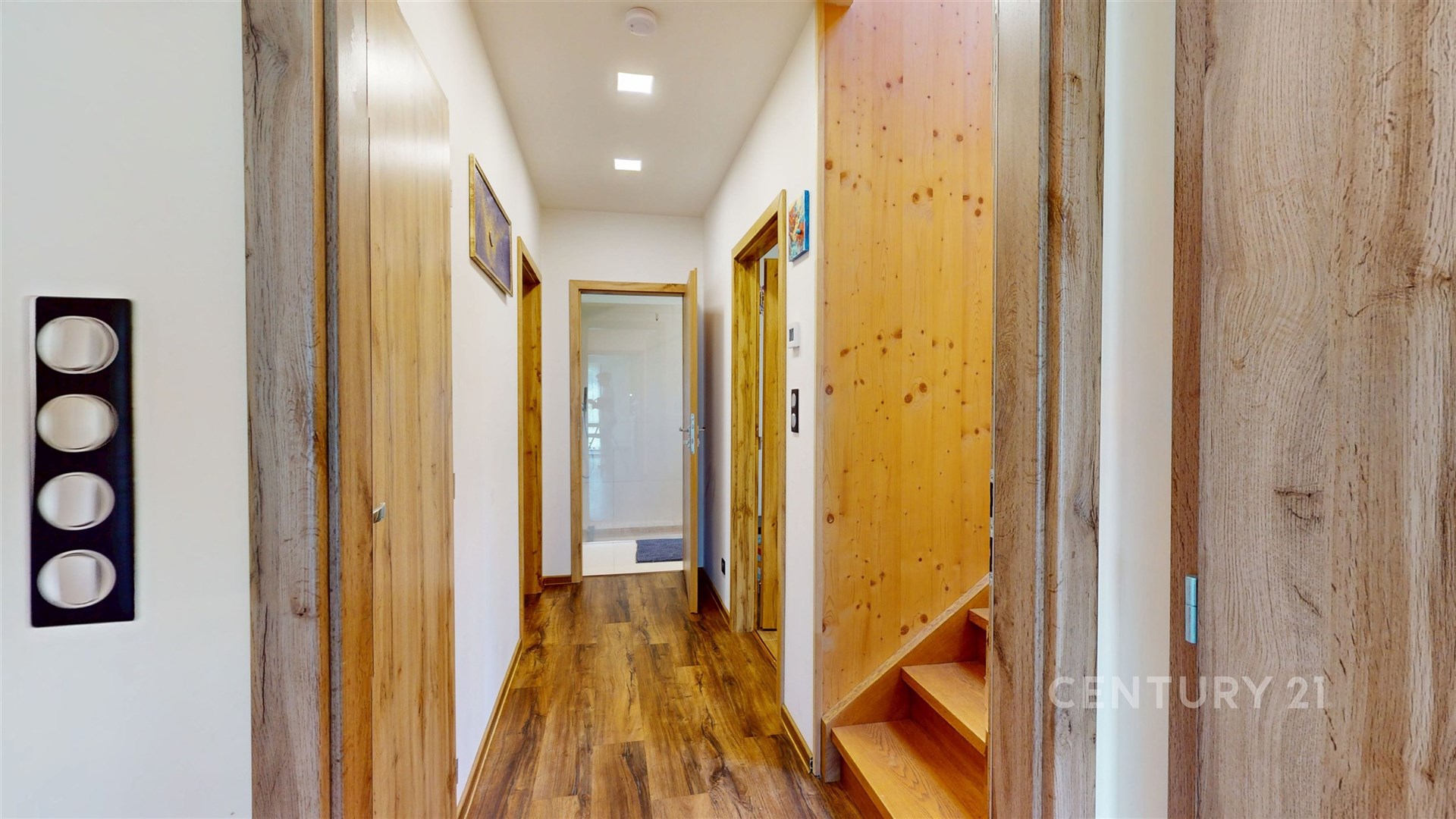 Dřevěné schodiště vás zavede do patra, kde jsou čtyři pokoje, koupelna a úklidová místnost.