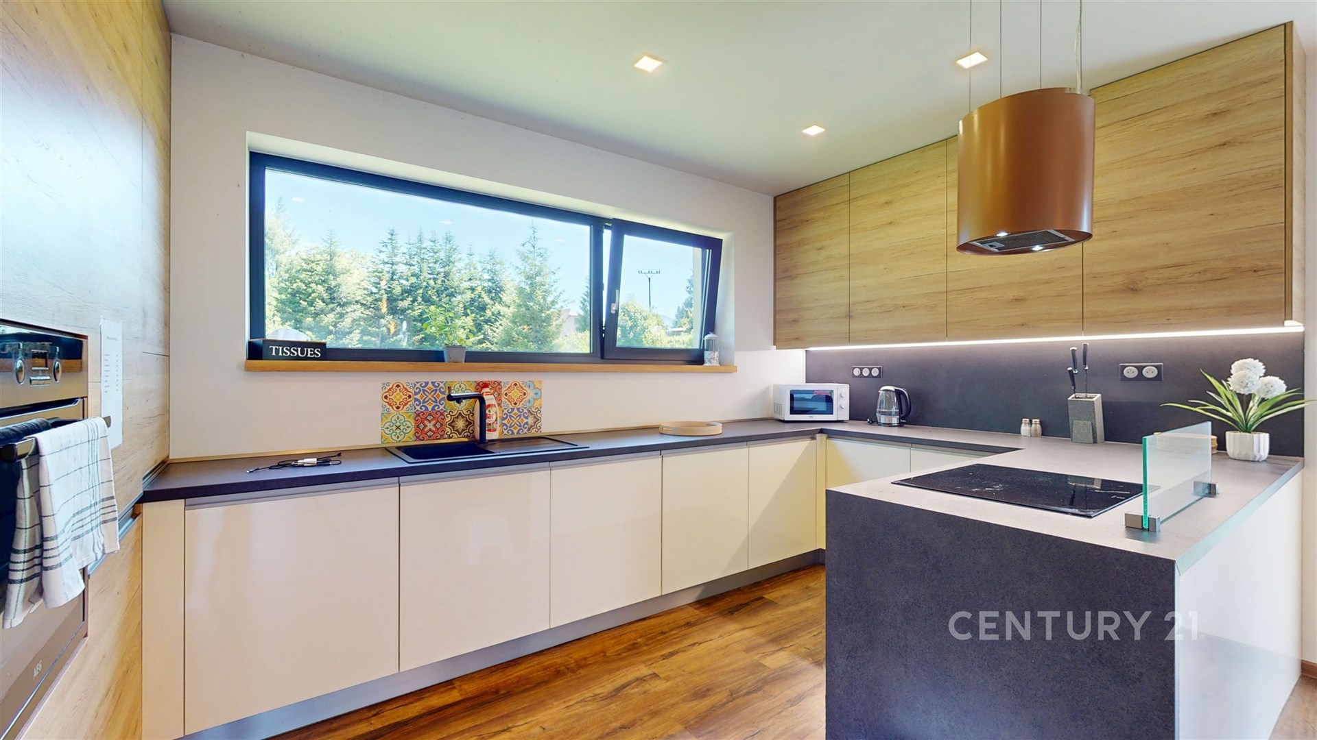 Kuchyňská část je vybavena moderní linkou se zabudovanými spotřebiči – myčka a lednice Beko, digestoř Klarstein, indukční deska Electrolux a trouba AEG.