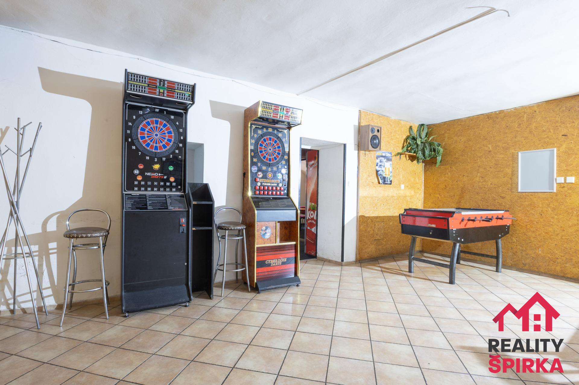 Dispozice zahrnuje hlavní místnost restaurace s výčepem, hernu, sklady, technické zázemí i kompletní sociální zařízení. Klenuté stropy podtrhují charakter místa, zatímco technické zázemí odpovídá provozním potřebám.