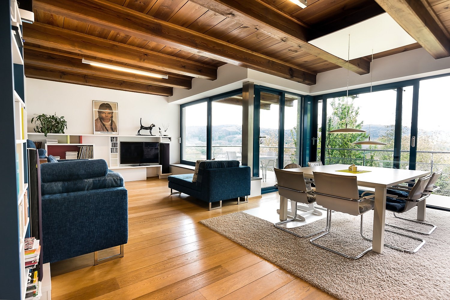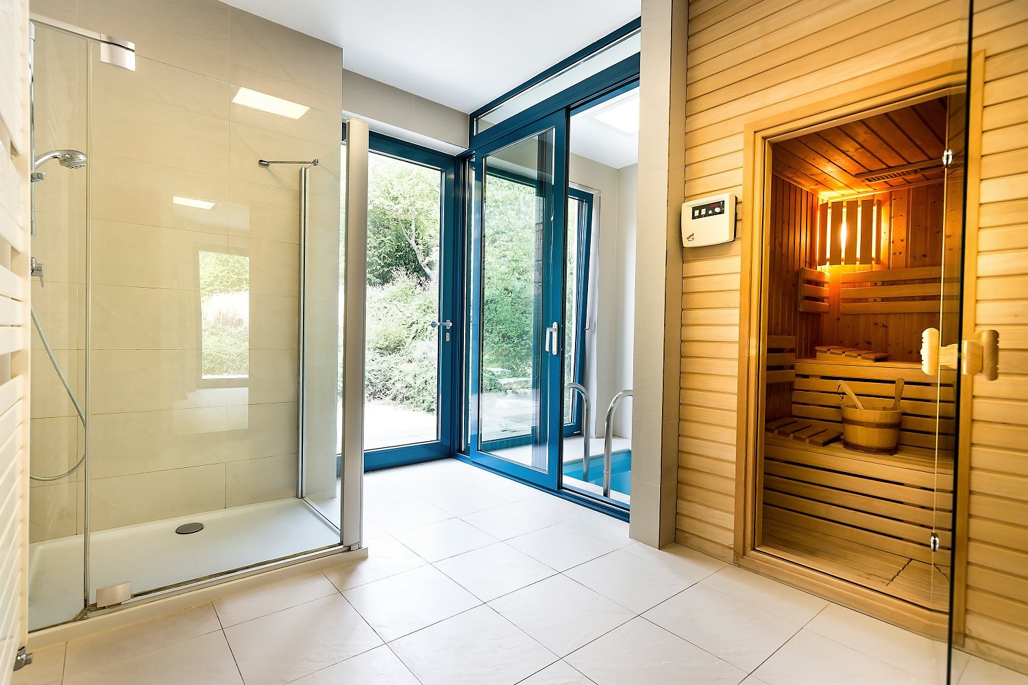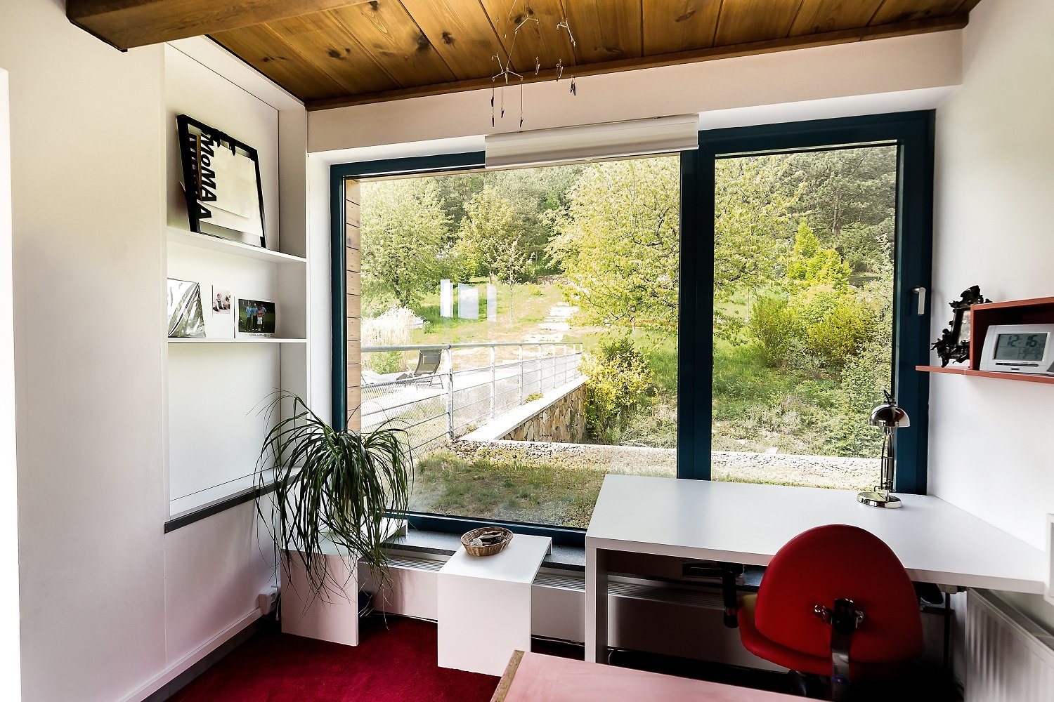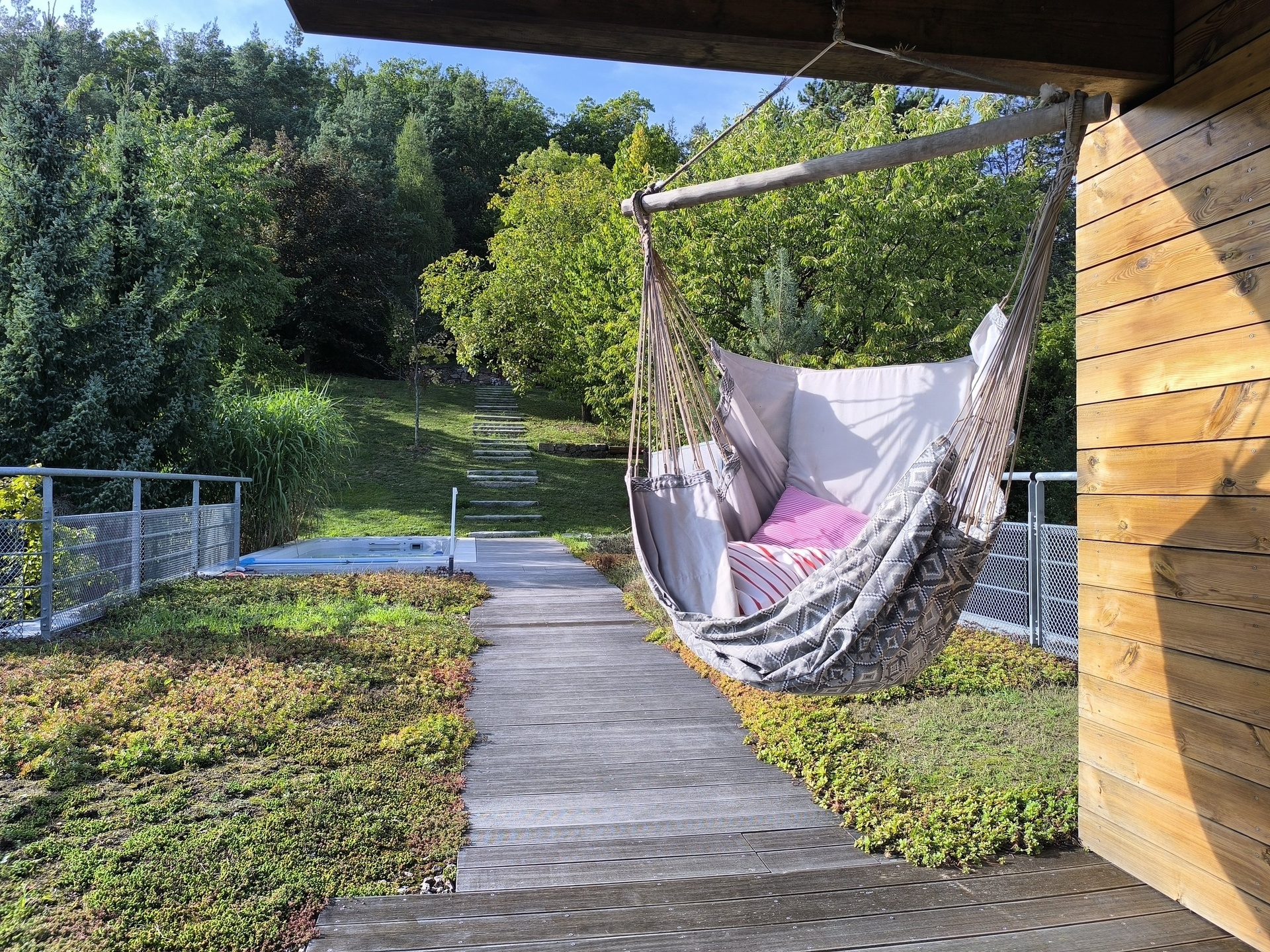 Zahrada nabízí příjemné propojení teras s obytným prostorem, najdete zde místa ideální pro posezení, grilování i klidný odpočinek. K dokonalému uvolnění přispívá také možnost relaxovat uvnitř v sauně, zatímco venku na střeše čeká vyhřívaný bazén s působivým výhledem do okolí. Celý venkovní prostor zkrášlují okrasné dřeviny a ovocné stromy, které dodávají zahradě charakter i nezaměnitelnou atmosféru. Na hranici lesa pak stojí samostatná rekreační chata, jež vytváří další unikátní zákoutí v srdci přírody.