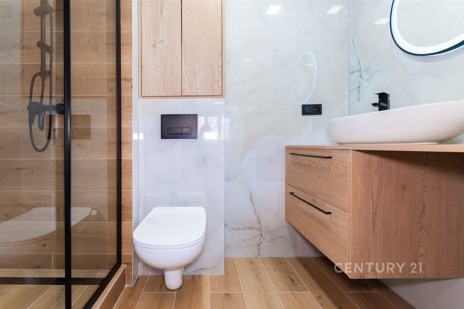 • Stylová koupelna se sprchovým koutem, velkoformátovými obklady, novým sanitárním vybavením, skříňkou pod umyvadlo, zrcadlo s podsvícením a WC