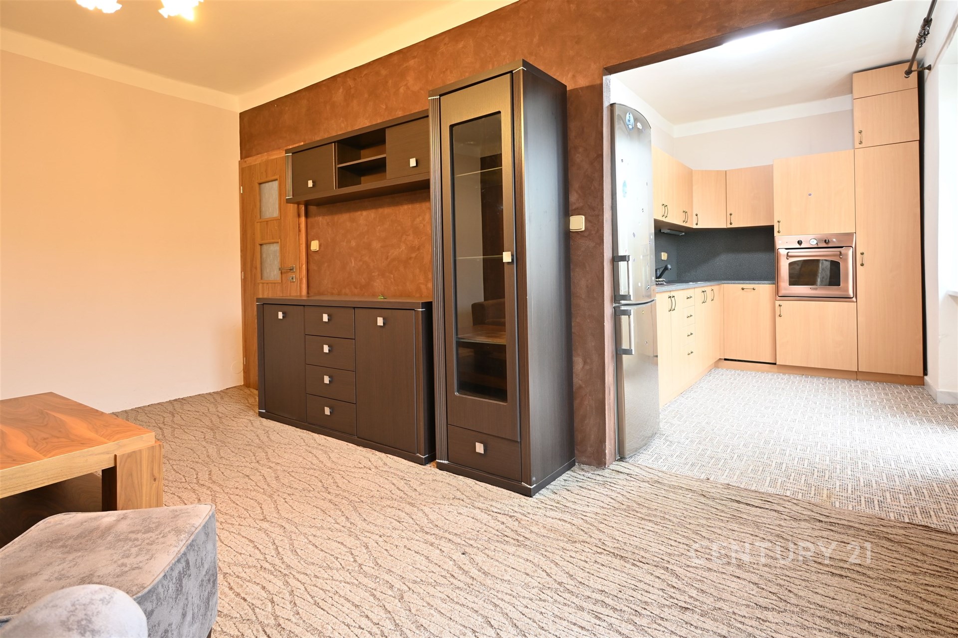 Disponuje vstupní chodbou, kde se po levé straně nachází skříň a odkládací stěna. Vlevo je ložnice, která je vybavená postelí a skříněmi. Z chodby se dostaneme dále do obývacího pokoje. Zde je sedačka, křeslo s taburetem, konferenční stůl a stěna. Z tohoto pokoje se vchází do kuchyně. Kuchyňská linka má elektrickou troubu, plynovou desku a lednici. Odsud je vchod na balkonek. Poslední místností je koupelna. Zde je sprchový kout, umyvadlo se zrcadlem, pračka a WC. V celém bytě jsou plastová okna a nové dveře.
