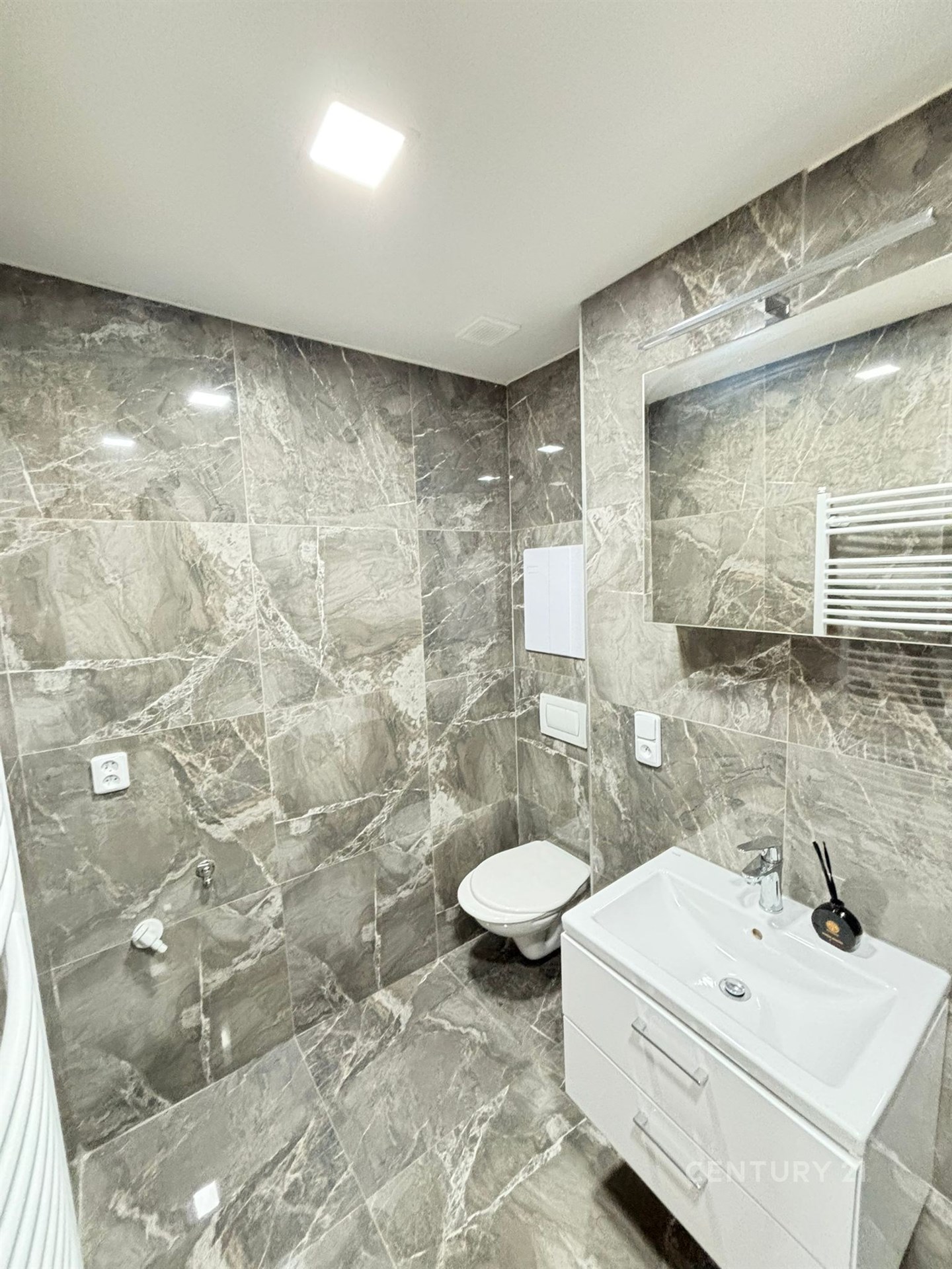 Naproti vstupním dveřím najdeme koupelnu se sprchovým koutem, umyvadlem, skříňkou, otopným žebříkem a WC.