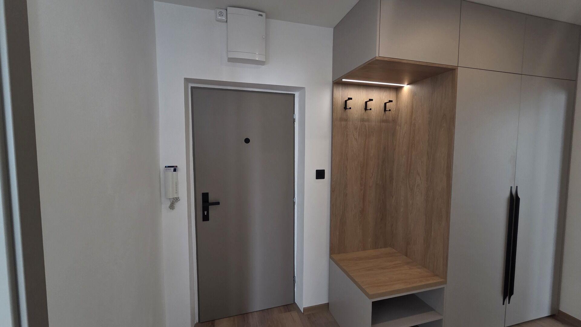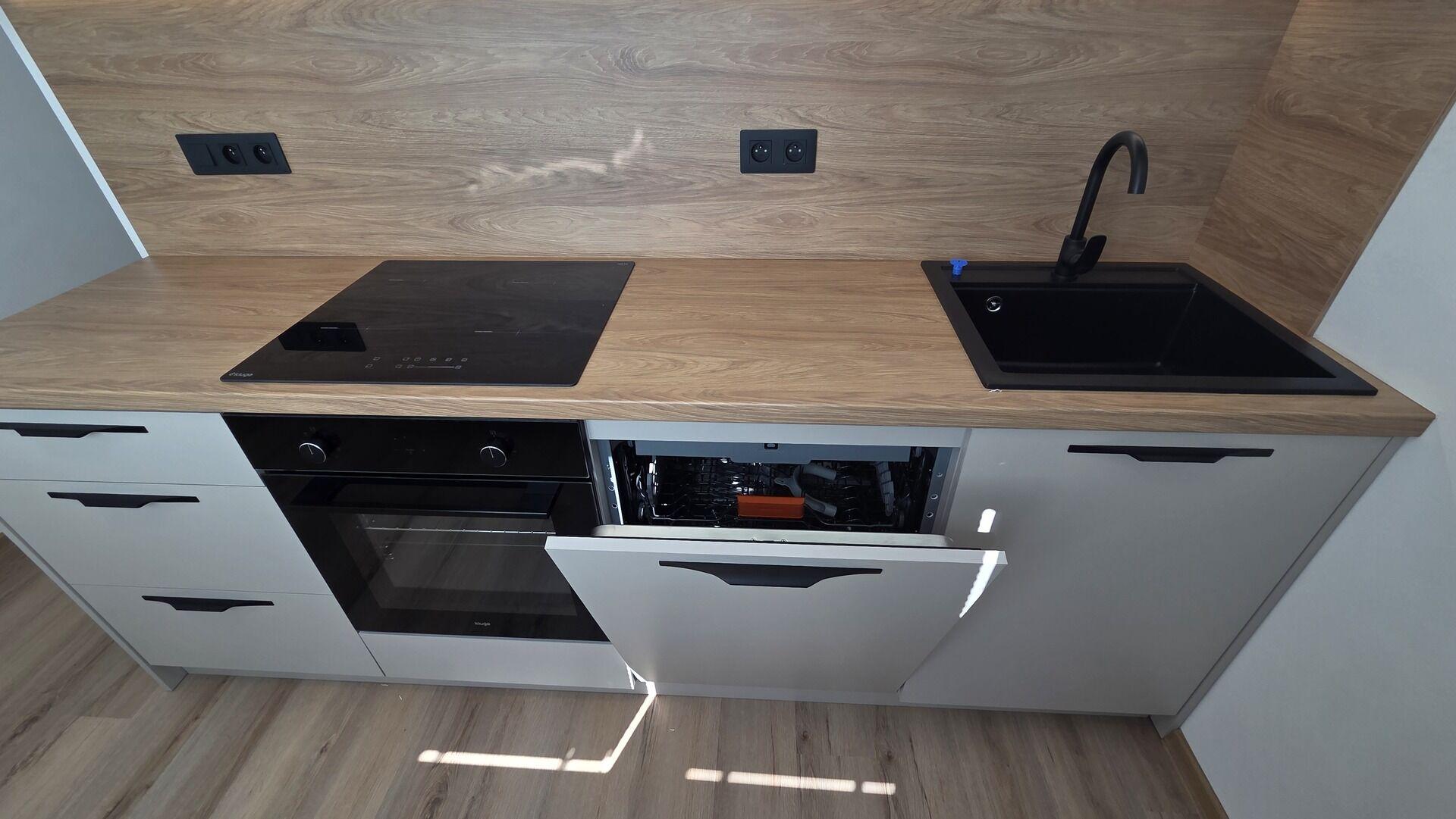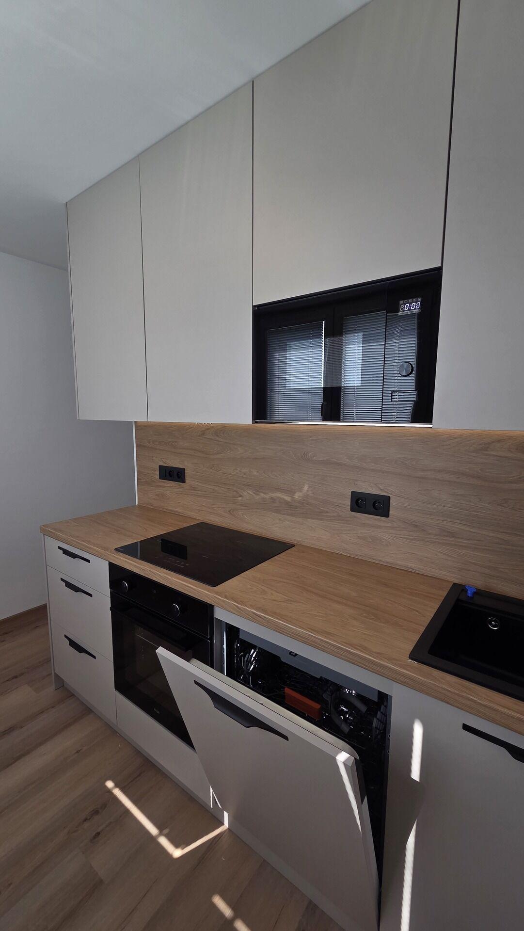 V bytě je vše nové, nové podlahy, nová koupelna, nová kuchyňská linka, nová světla, vypínače, bezfalcové dveře s obložkami. Celý interiér je pečlivě sladěný do nejmenšího detailu a zároveň každý detail je důležitý. Bezesporu největší dominantou bytu je kuchyňská linka s vestavěnými spotřebiči a vestavěná šatní skříň v chodbě. Vše bylo vyrobeno na míru pro tuto bytovou jednotku, pro Vás a Vaše příjemné bydlení.