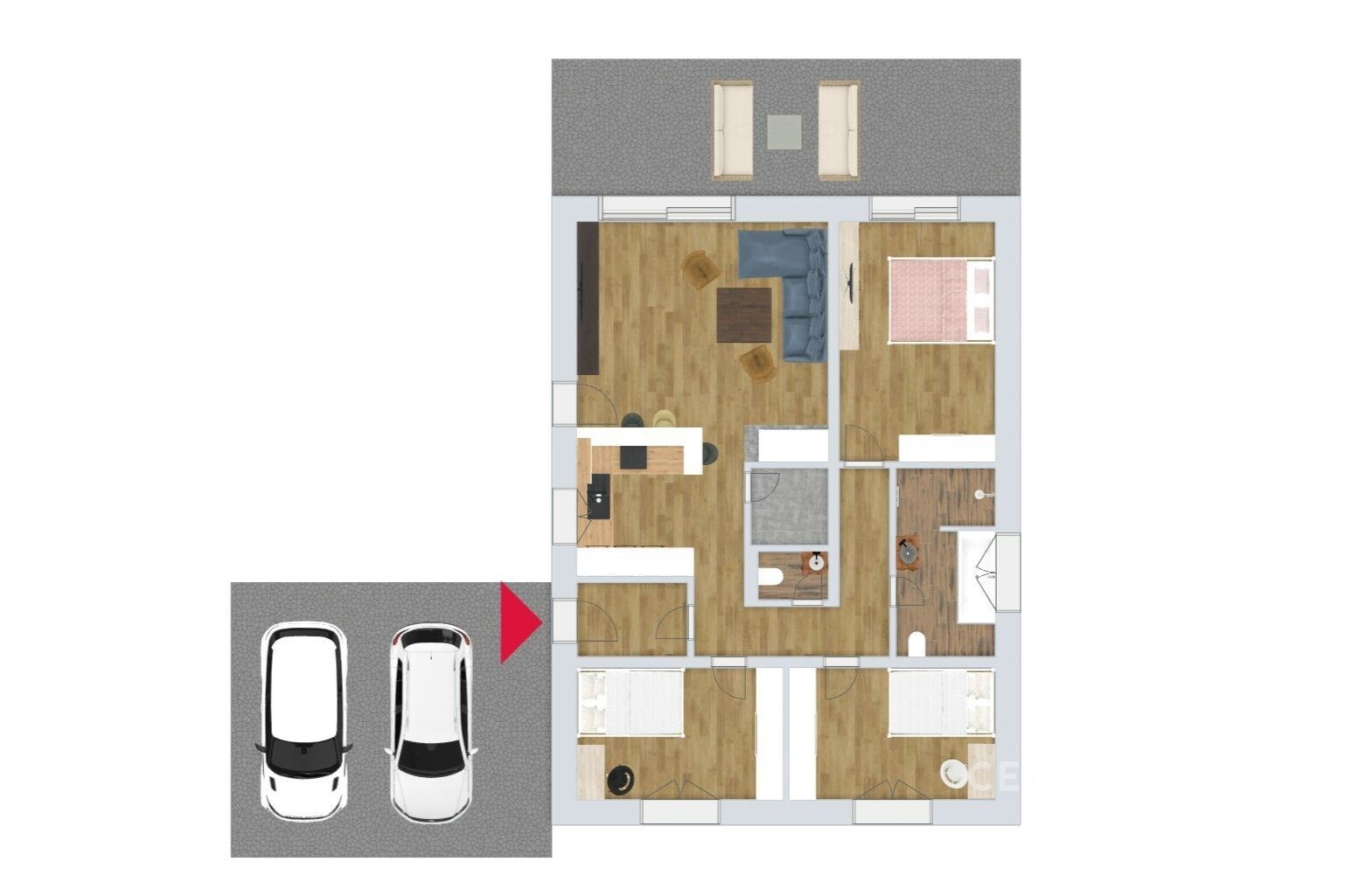 U domu je kryté parkovací stání o ploše 42 m2, kde pohodlně zaparkují dvě auta. Dům nabízí obývací pokoj propojený s jídelním a kuchyňským prostorem a výstupem na terasu o výměře 30,36 m2, dále pak 3 samostatné pokoje, technickou místnost, samostatné WC a koupelna spojená s toaletou. Dům je již plně zařízen, včetně veškerého nábytku a elektrospotřebičů.