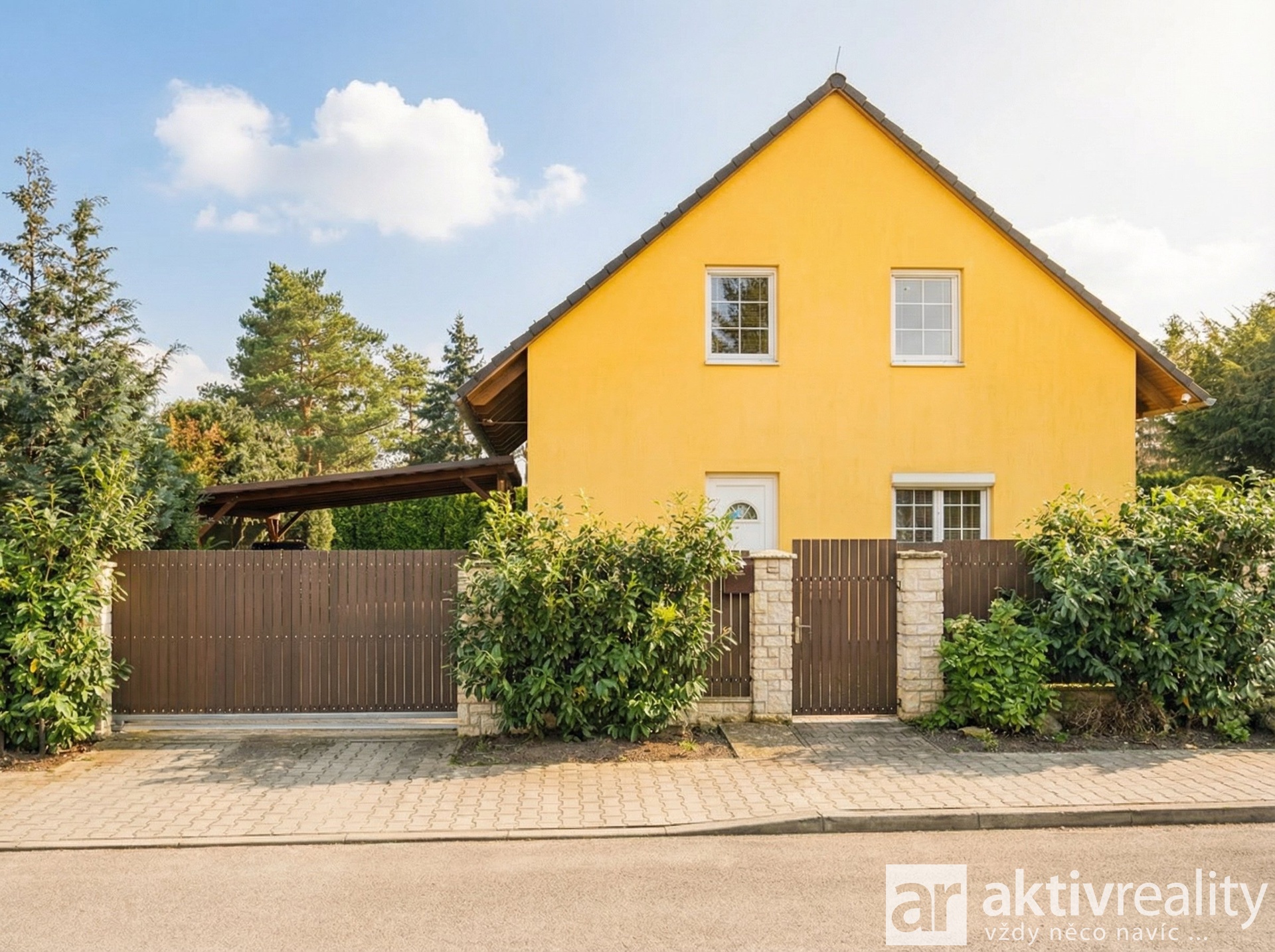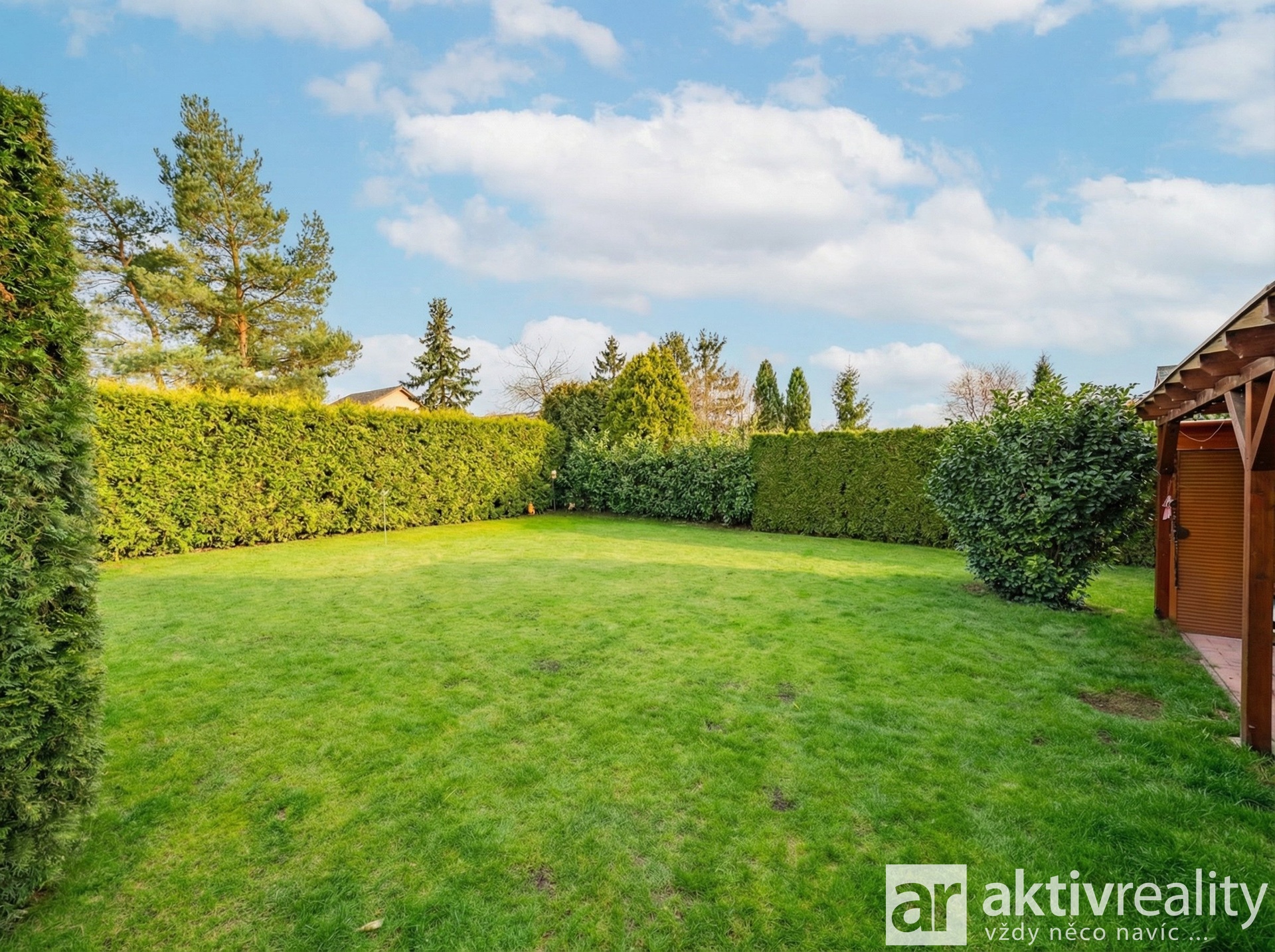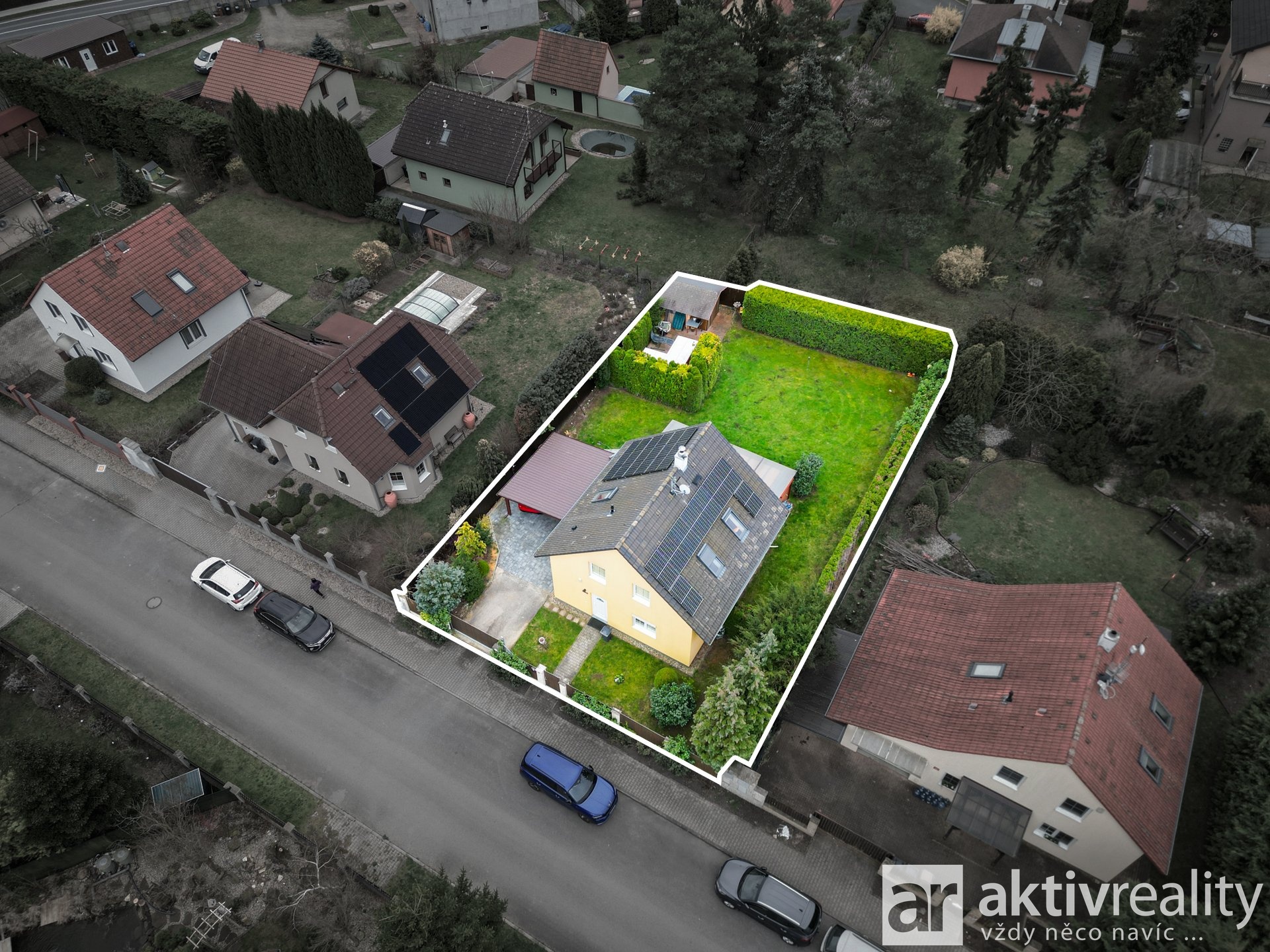 Pozemek je upraven s důrazem na praktičnost i soukromí. K dispozici je kryté parkovací stání pro dva vozy, vjezd je řešen elektricky ovládanou bránou a okolí domu je vydlážděno zámkovou dlažbou. Zahrada je orientována na jih, je vzrostlá a poskytuje příjemné soukromí bez rušivých vlivů okolí. Součástí je také zahradní domek a další úložný prostor na půdě domu.