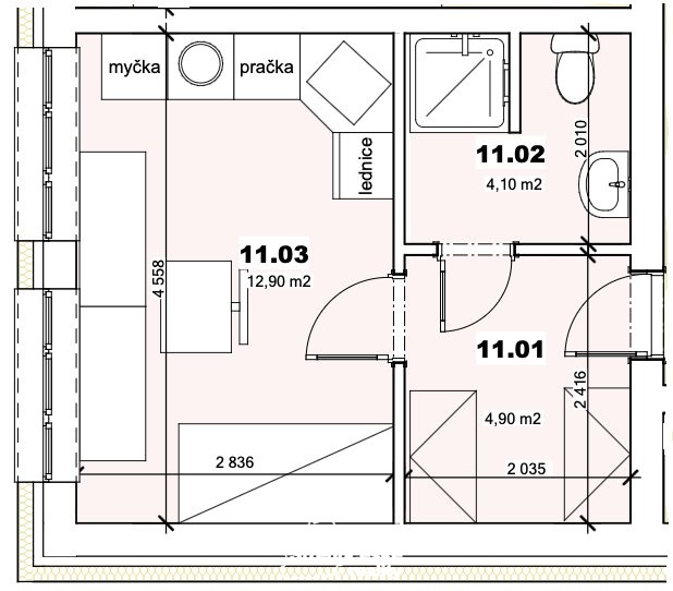 | Dispozice/podlahová plocha: | 1+kk/22 m² |