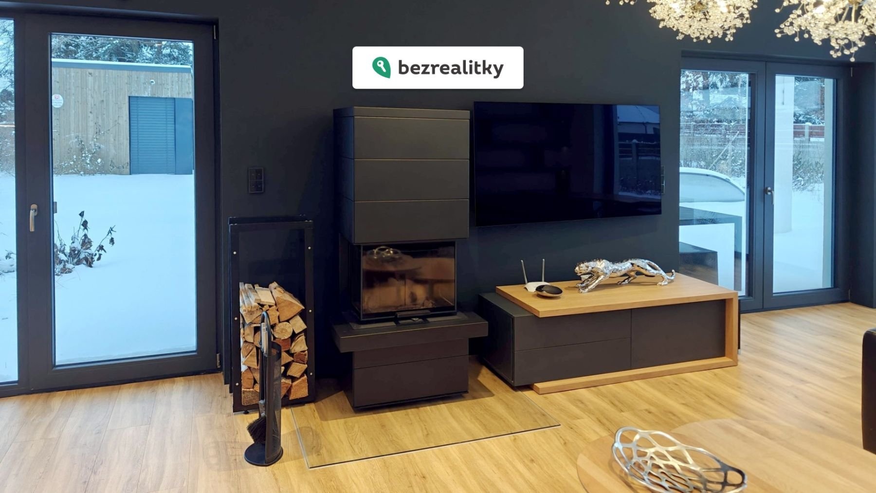 - prostorný a světlý obývací pokoj s krbem na dřevo, který lze v zimních měsících využít i na vytápění celého domu