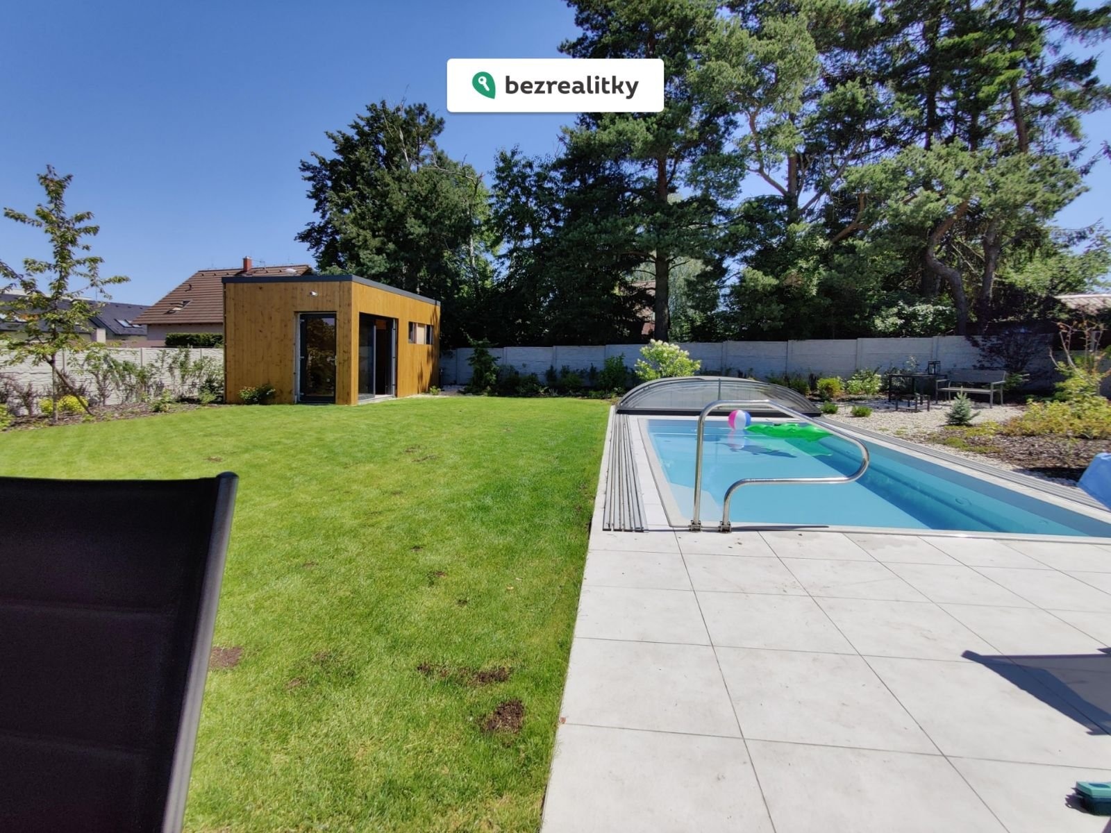 Součástí zahrady je také designový zahradní domek s koupelnou a WC, samostatným pokojem a technickou místností (sklad).