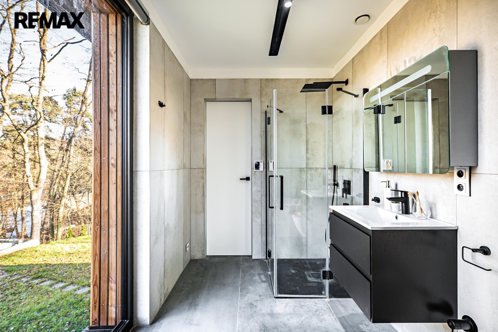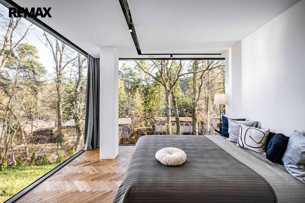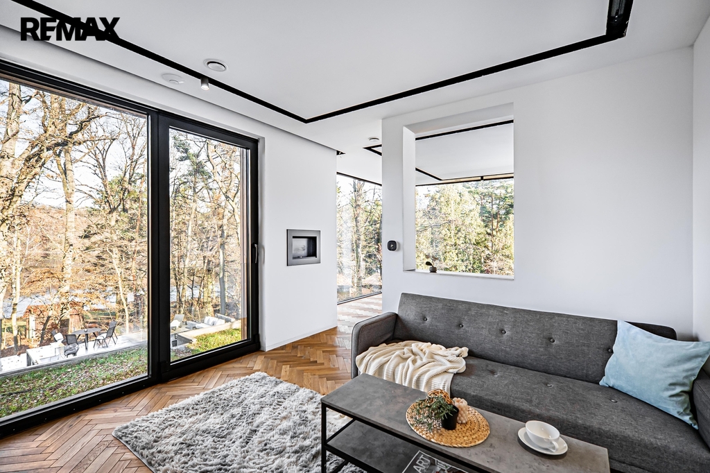 Interiér je navržen v moderním, nadčasovém stylu s důrazem na kvalitní materiály a detail. Podlahy obytných místností tvoří parkety v rybinovém vzoru, ostatní prostory jsou řešeny velkoformátovou dlažbou. Hliníková okna s trojskly zajišťují výborné tepelně-izolační vlastnosti i dostatek denního světla. Skryté zárubně a bezfalcové dveře podtrhují čistý architektonický výraz interiéru.