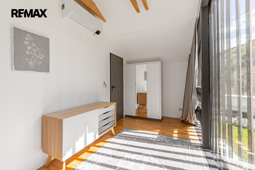 V přízemí chaty se nachází zádveří s šatní skříní, vybavený elegantní kuchyňský kout spojený s prostorným obývacím pokojem, vhodným pro společenské chvíle i relaxaci a moderní koupelna se sprchovým koutem. Ve druhém podlaží se nachází dvě útulné ložnice, což zajišťuje dostatek soukromí a pohodlí. Z každé místnosti se vám dostane překrásného výhledu do přírody.