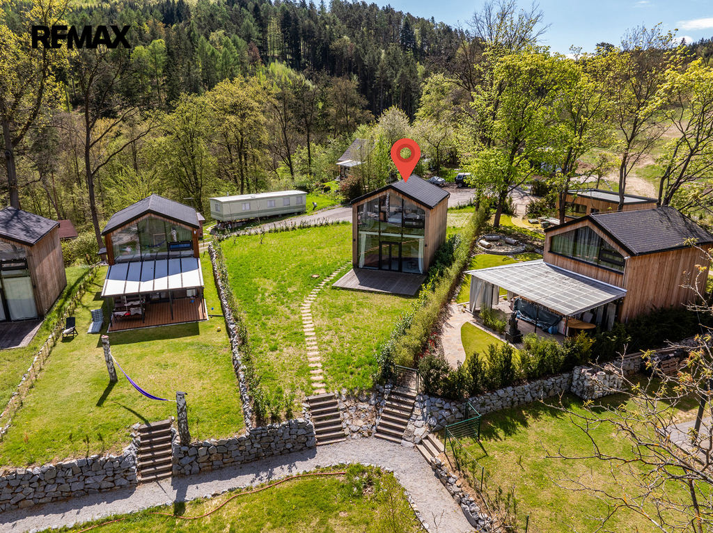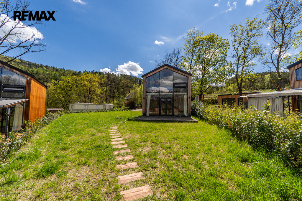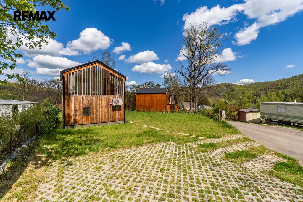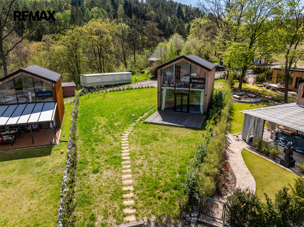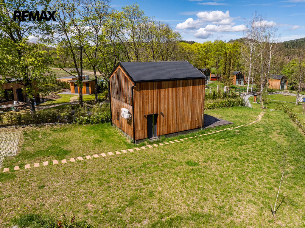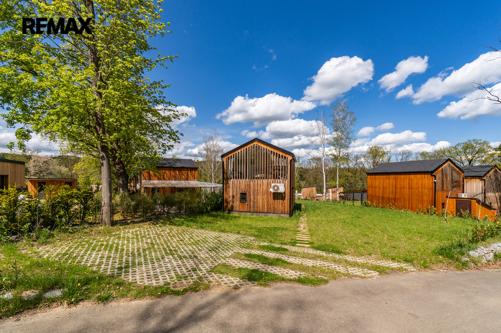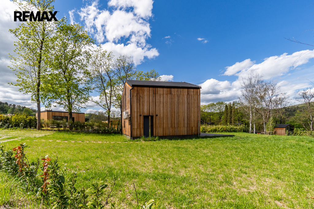 Interiér byl navržen velmi vkusně, elegantně a prakticky. Použité materiály kombinují přírodní dřevěný obklad fasády, velkoformátová okna na čelních stranách a střechu pokrytou kvalitním bonnským šindelem. Objekt je možno využívat víkendově, pro dlouhodobé relaxační účely nebo je možné chatu využívat k investičním účelům. Koupání je vzdálené jen pár kroků.