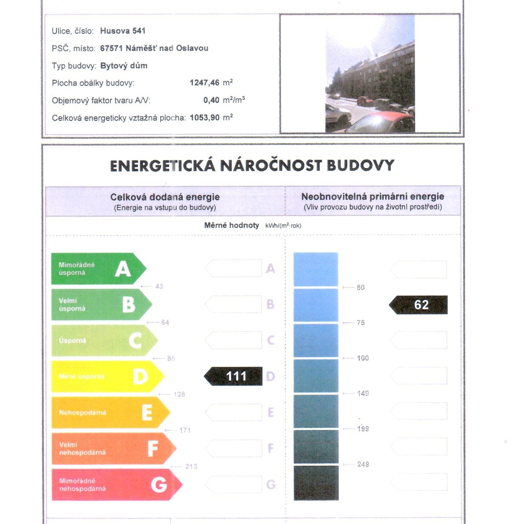 - Ukazatel energetické náročnosti budovy: 111 kWh/m²
