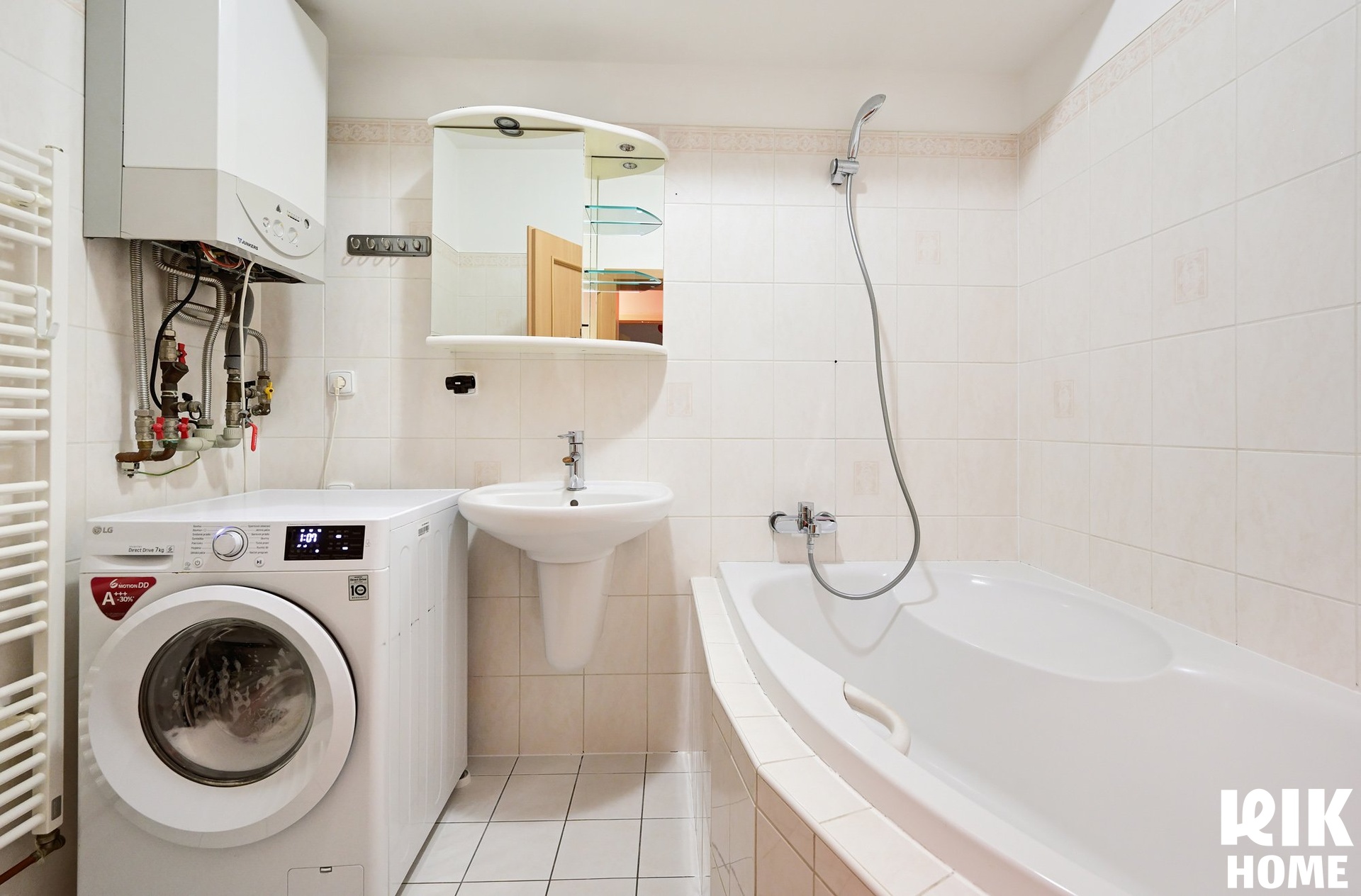 Ohřev vody a systém topení zajišťuje pravidelně servisovaný plynový kotel Junkers s velmi nízkou spotřebou zemního plynu.
