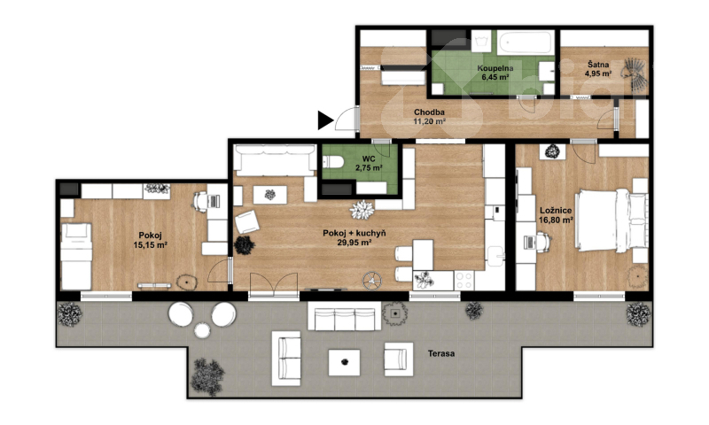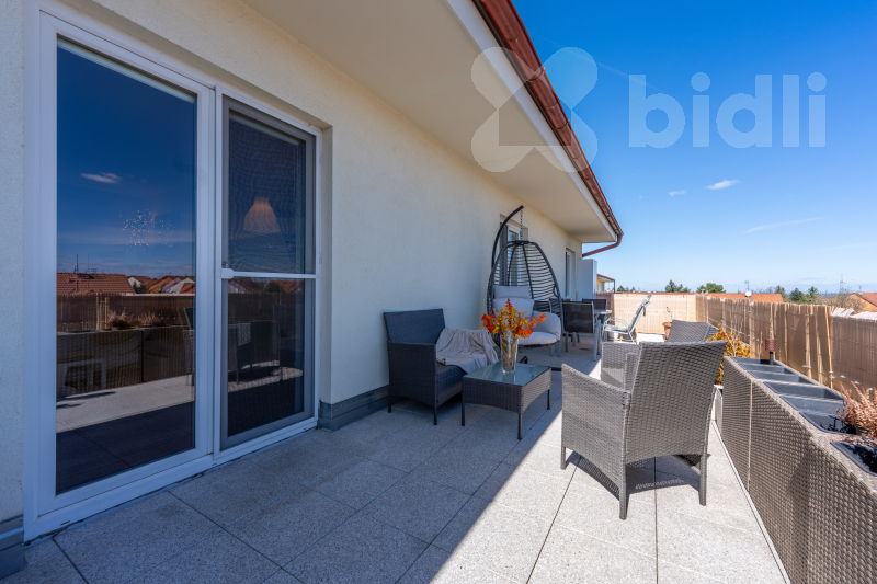 Prodej bytu 90,9 m2 s terasou 36,2 m2 a parkovacím stáním v Nehvizdech