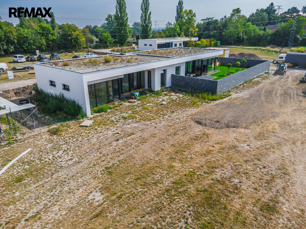 Rodinný dům nabízí 124 m² užitné plochy, nadstandardní stropy 3,25 m, dřevěnou podlahu DUB, interiérové bezfalcové dveře, hliníkové posuvné portály s trojsklem, žaluzie a další designové detaily připravené architektem. Vnitřní dispozice jsou promyšlené s dostatkem úložných prostor a možností individuální úpravy. Nosné stěny jsou železobetonový monolit, vnitřní příčky z polystyrenových tvárnic MAXPLUS.