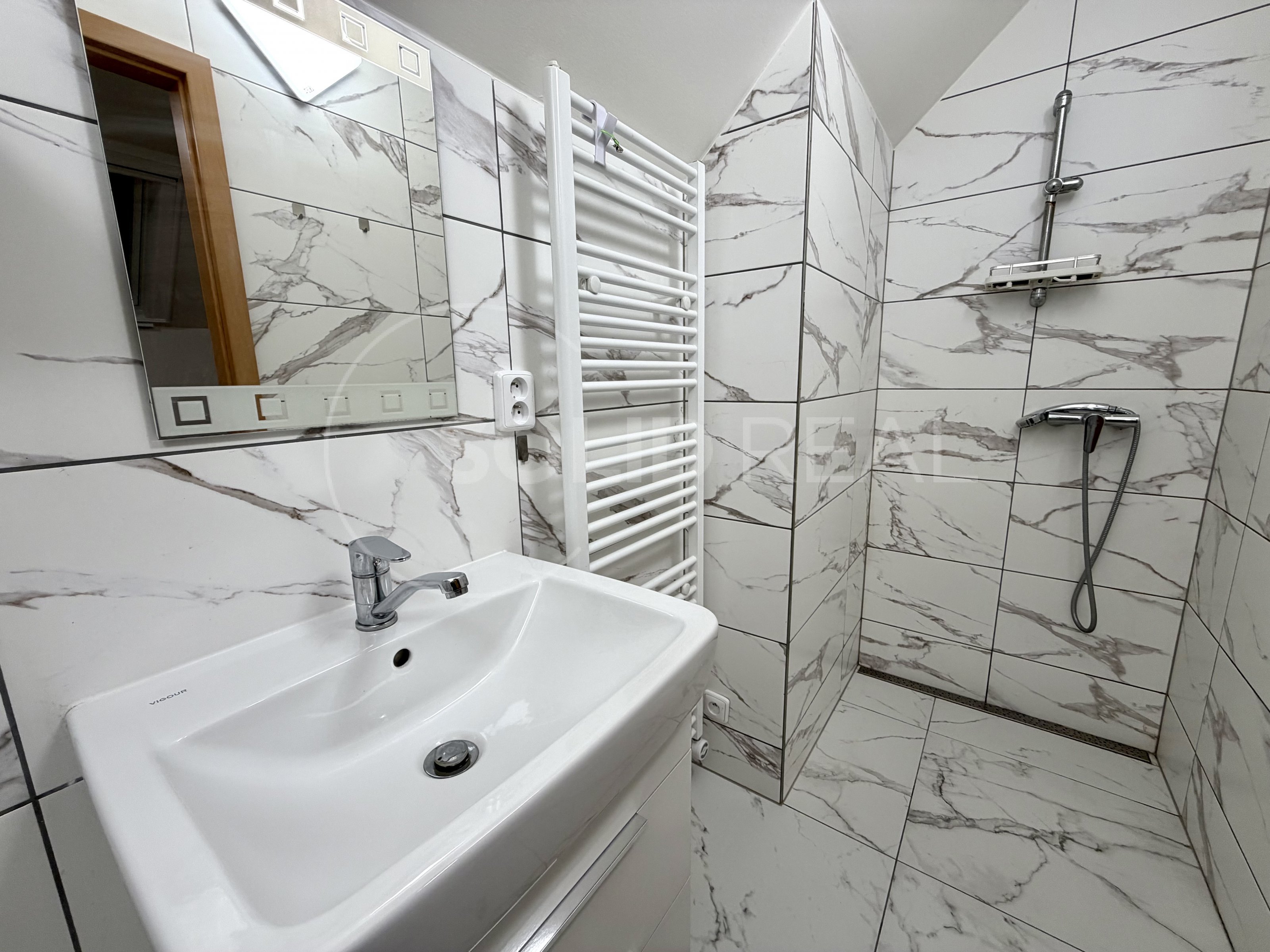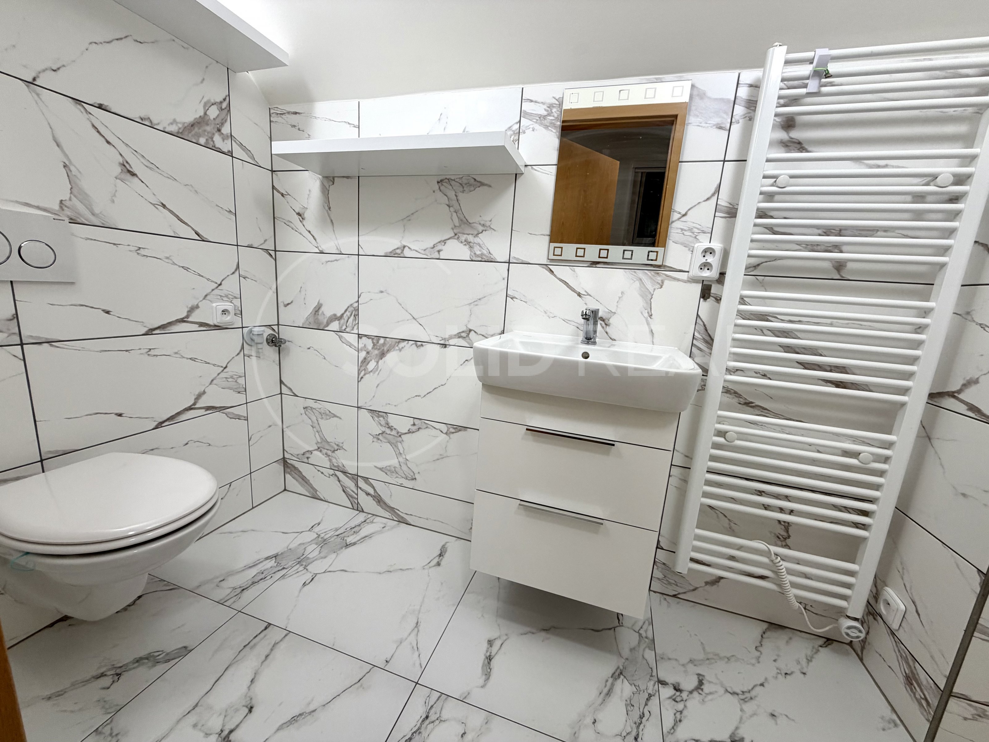 • Koupelna: Velkoryse řešená koupelna spojená s toaletou, zařízená v moderním designu.