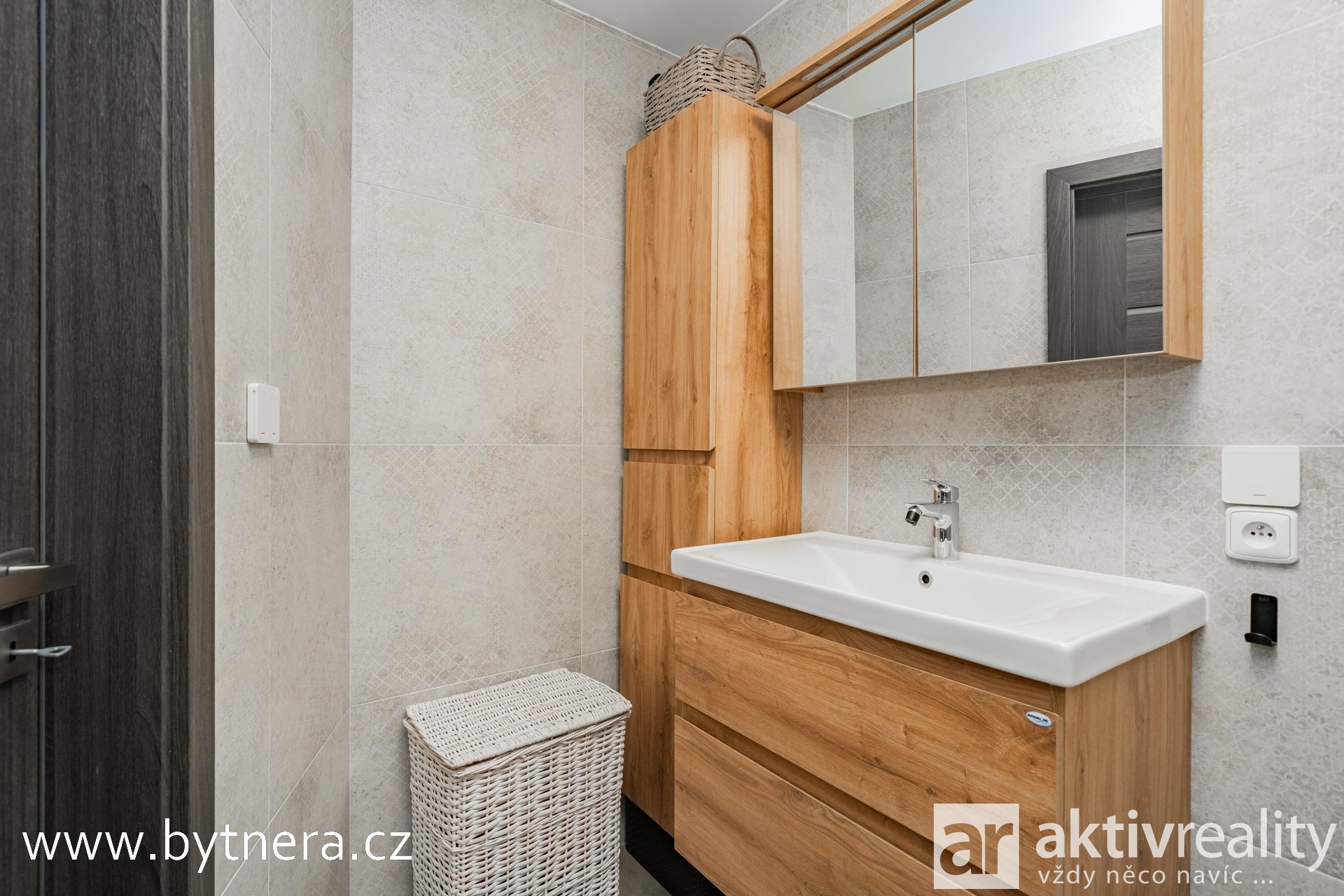 Disponuje světlým obývacím pokojem s jídelním koutem a vstupem na zasklenou lodžii. Kuchyně je vybavena novou moderní kuchyňskou linkou se zabudovanými spotřebiči a nabízí dvě praktické špajzy. K dispozici jsou dále dva samostatné pokoje – ložnice a dětský pokoj – s příjemným výhledem do okolí. Prostorná moderní koupelna je vybavena vanou a přípojkou na pračku, přičemž zde zůstal dostatek místa i pro sušičku.