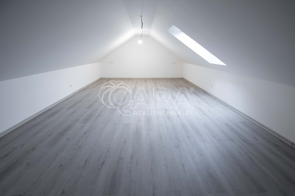V přízemí vstupní chodba, prostorný obývací pokoj s kuchyňským koutem, koupelna s WC a samostatný pokoj, celková velikost 73,4 m2. V podkroví chodba a dvě samostatné ložnice o celkové velikosti 69,5 m2.