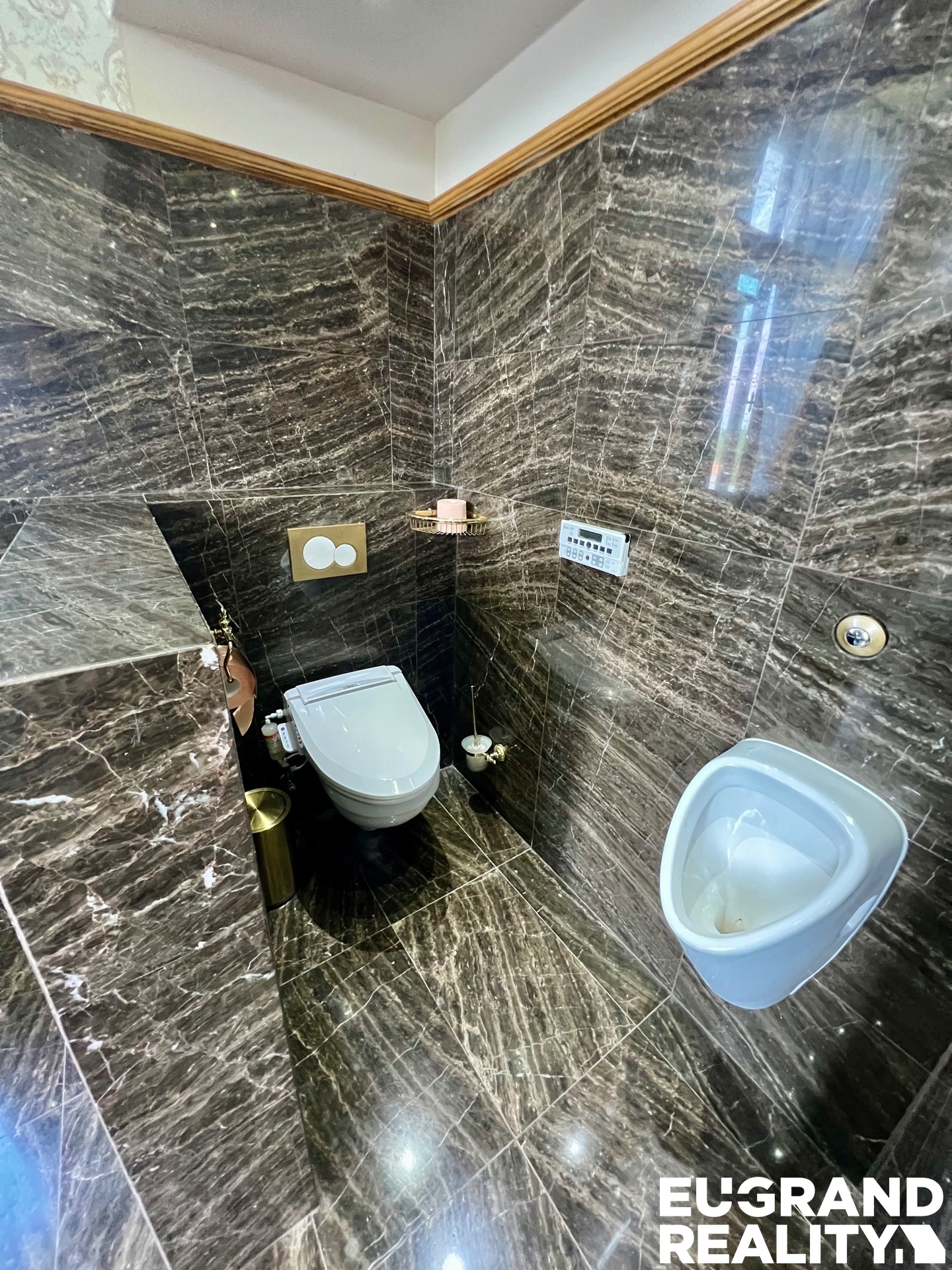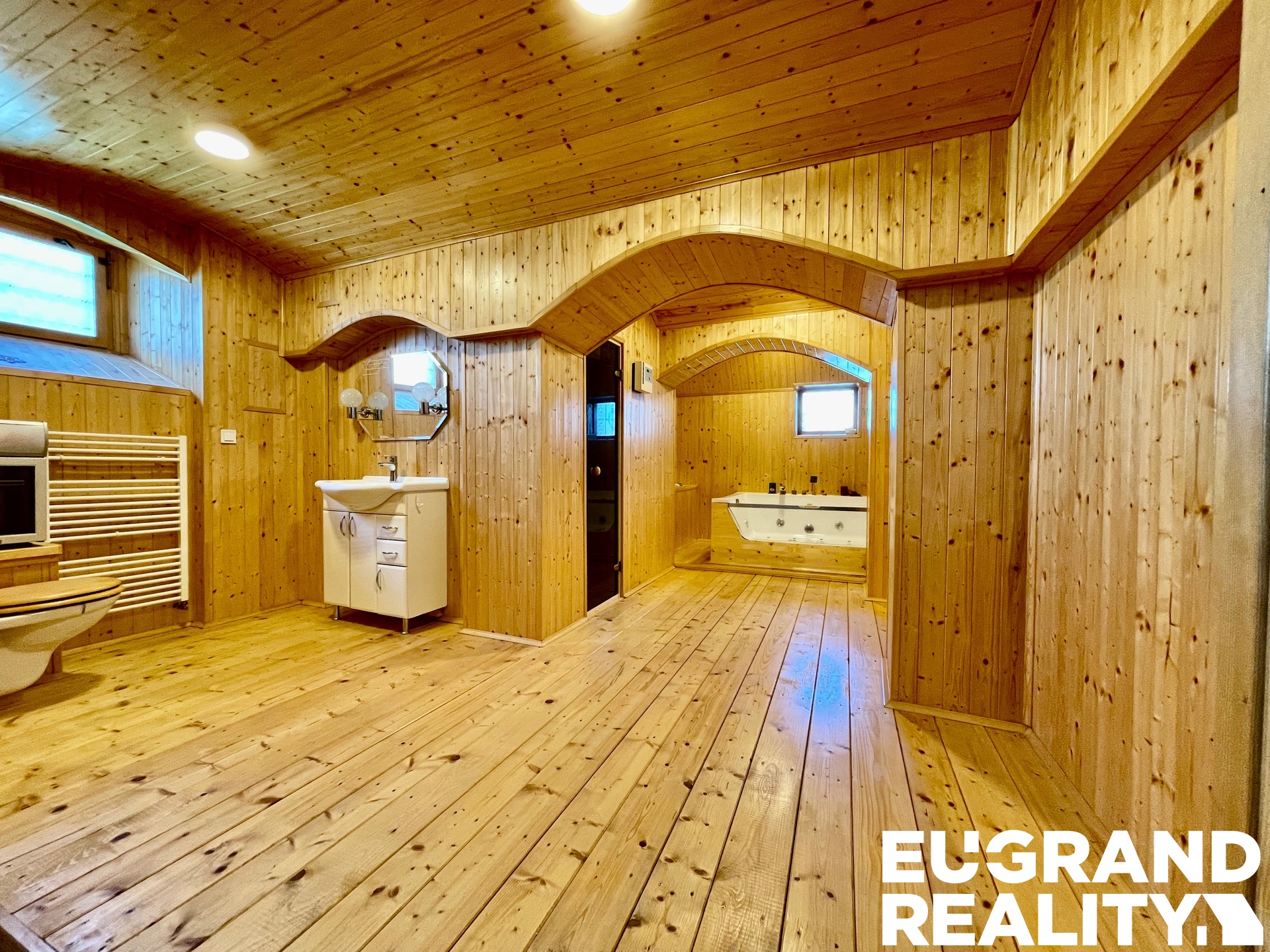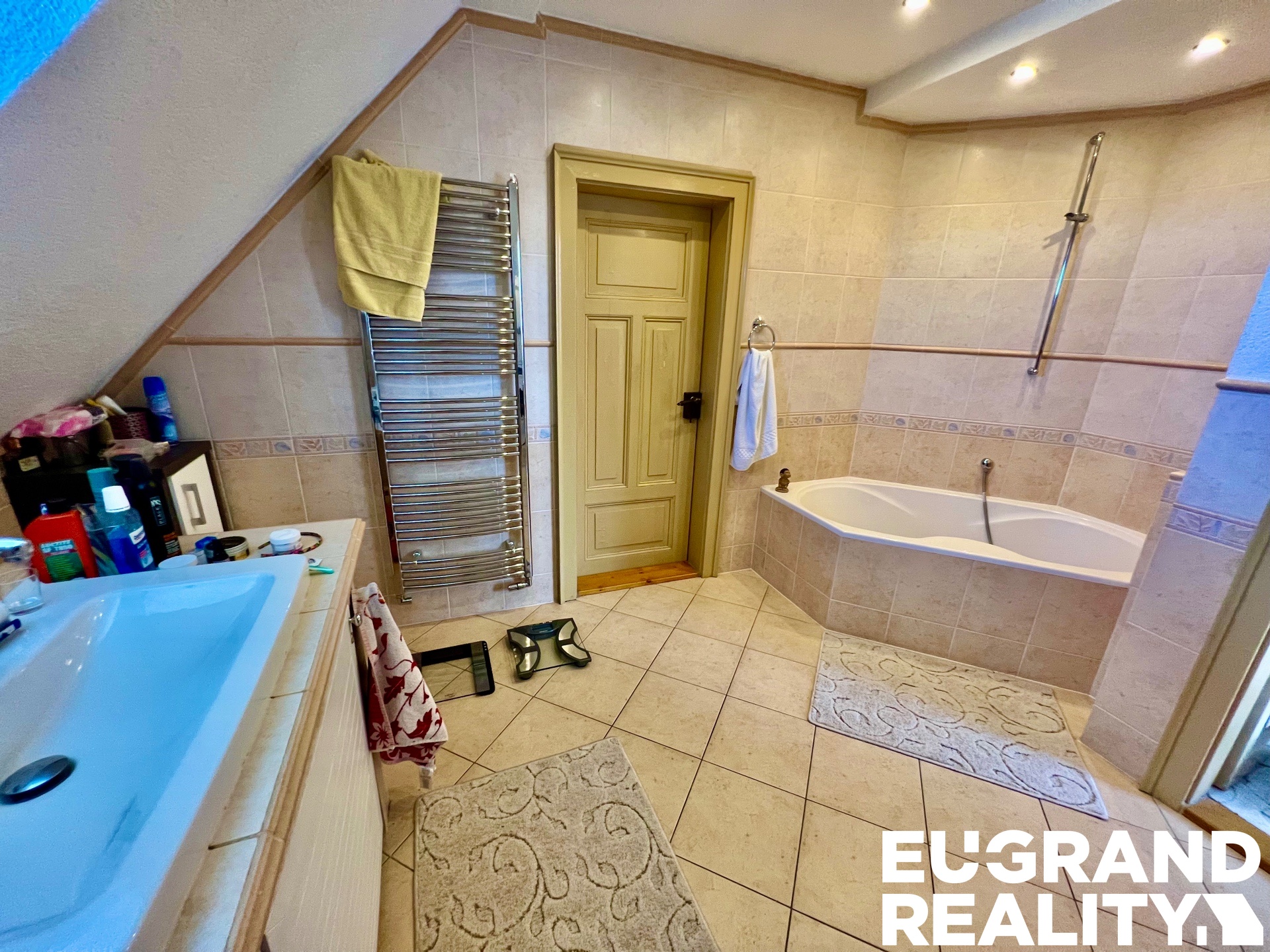 Z hlavní haly v 1. NP se projde do prostorné koupelny, která je jako spodní koupelna z mramoru se stylovými doplňky, s vestavěnou vanou s japonským záchodem, pisoárem. Z koupelny se jde po schodech do 2. NP podkroví.