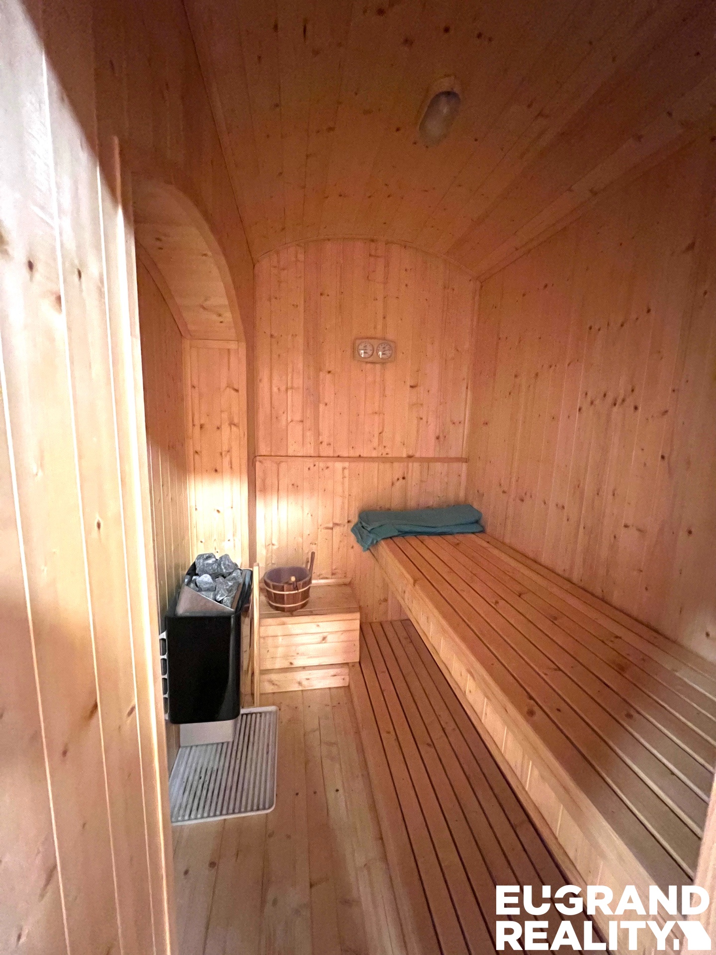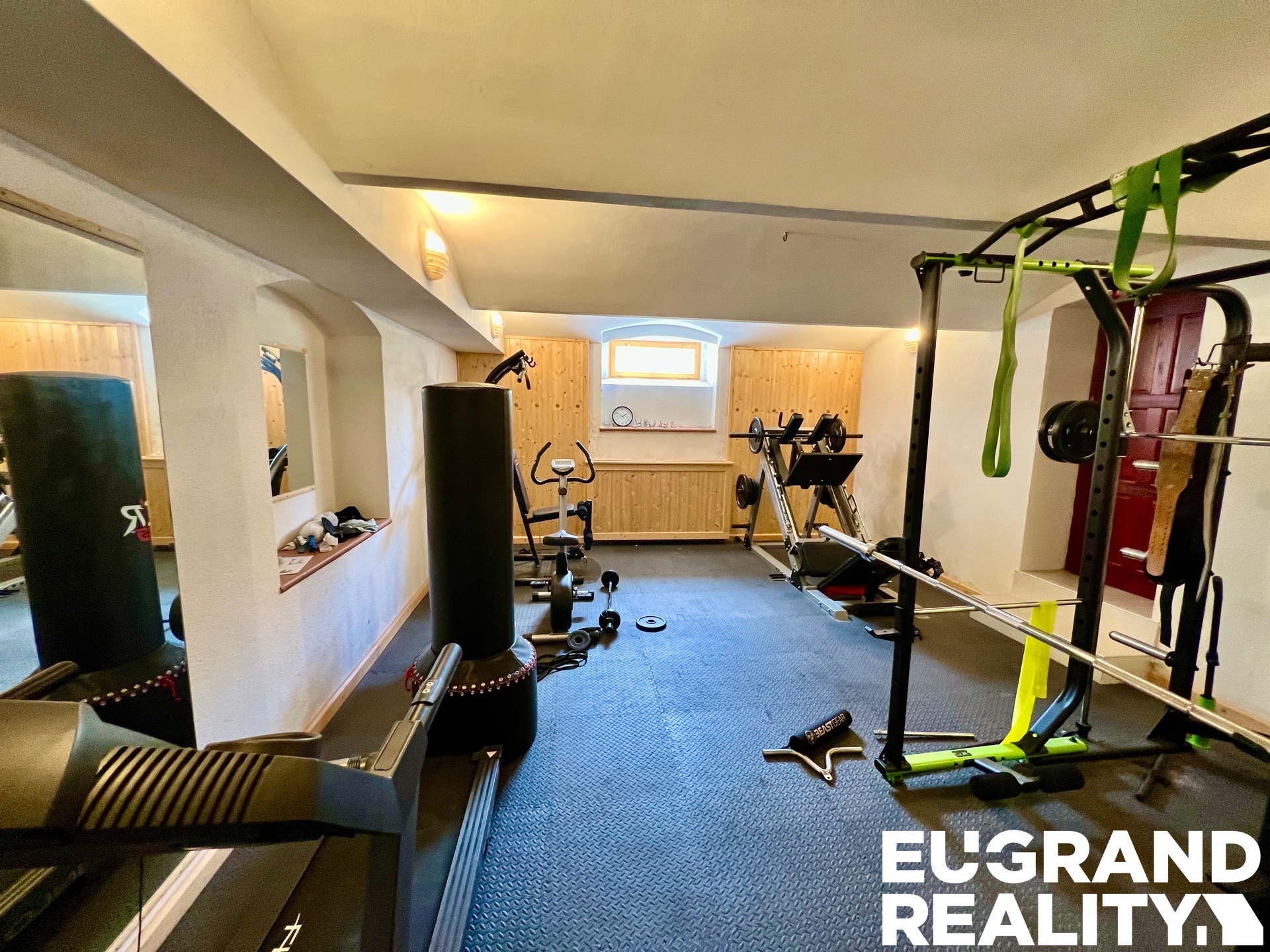 Vila je kompletně podsklepená a ve sklepě jsou 4 místnosti, v jedné místnosti je umístěn kulečník a ve druhé vinný sklep. V další místnosti se nachází kotelna na pelety, která je plně automaticky ovládána z obývacího pokoje nebo telefonicky a disponuje velkým zásobníkem na pelety. V dalších prostorách se nachází místnost sloužící jako posilovna s vchodem na zahradu, pod terasou je kotec pro psa a sklad nářadí. Hlavní dominantní místnost v tomto podlaží je kompletní saunový systém s vířivou vanou, saunou a malým bazénkem.
