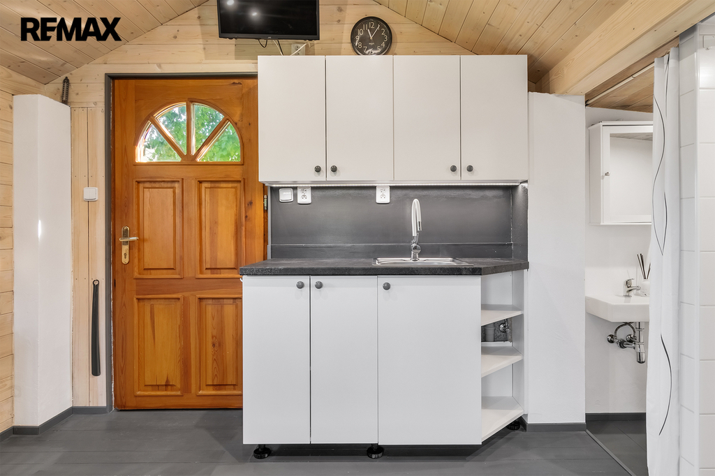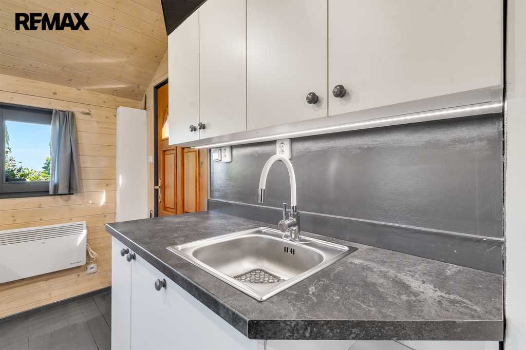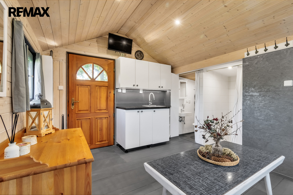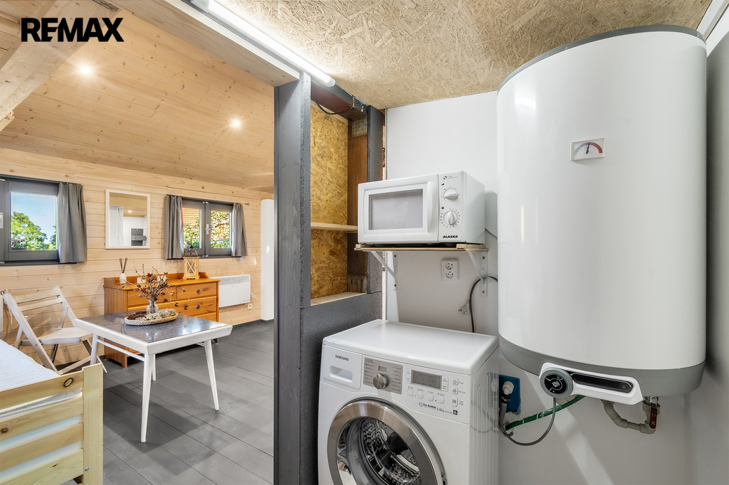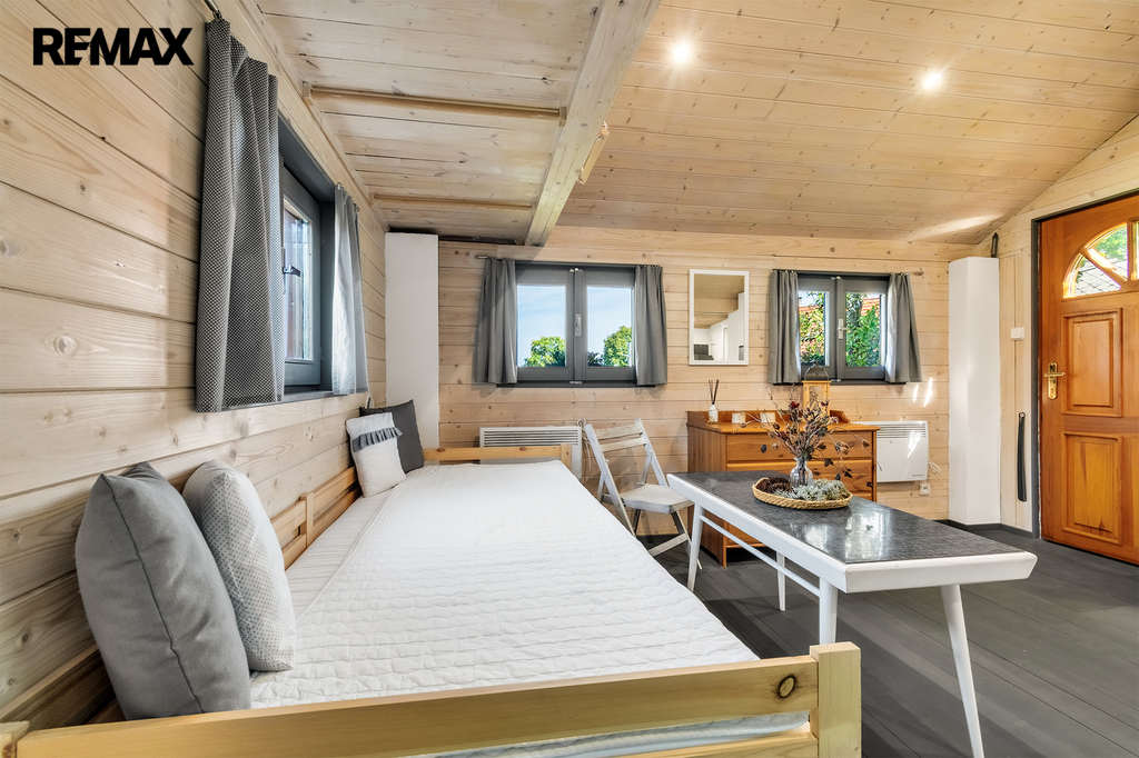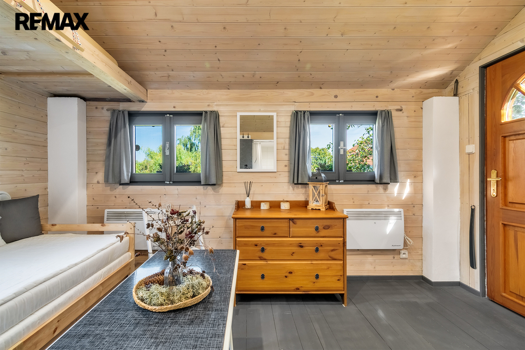 - vybavení: dřevěná podlaha, dřevěná okna, kuchyňská linka s přípojkou na myčku, umyvadlo, sprcha a WC, šatna s místem na pračku, lednice, TV