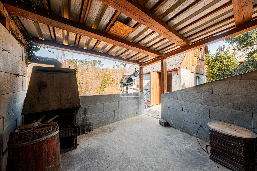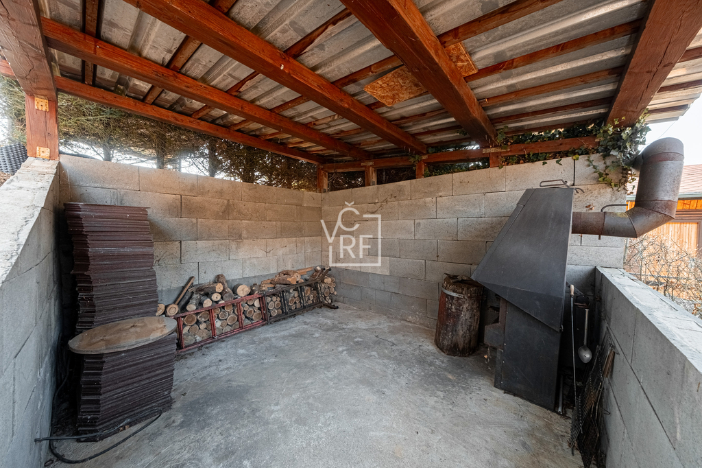 Na pozemku je vybudovaná pergola s posezením a venkovním grilem, která vytváří ideální zázemí pro trávení volného času.