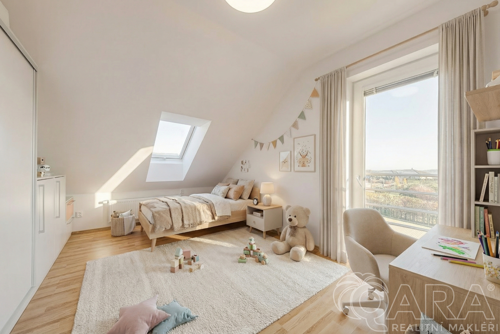 2. NP - hala s přístupem na pochozí půdu, čtyři pokoje (17,3 m2, 15 m2, 15,6 m2, 15,6 m2), z toho dva z nich se vstupem na balkon, rodinná koupelna s vanou, sprchovým koutem a samostatné WC