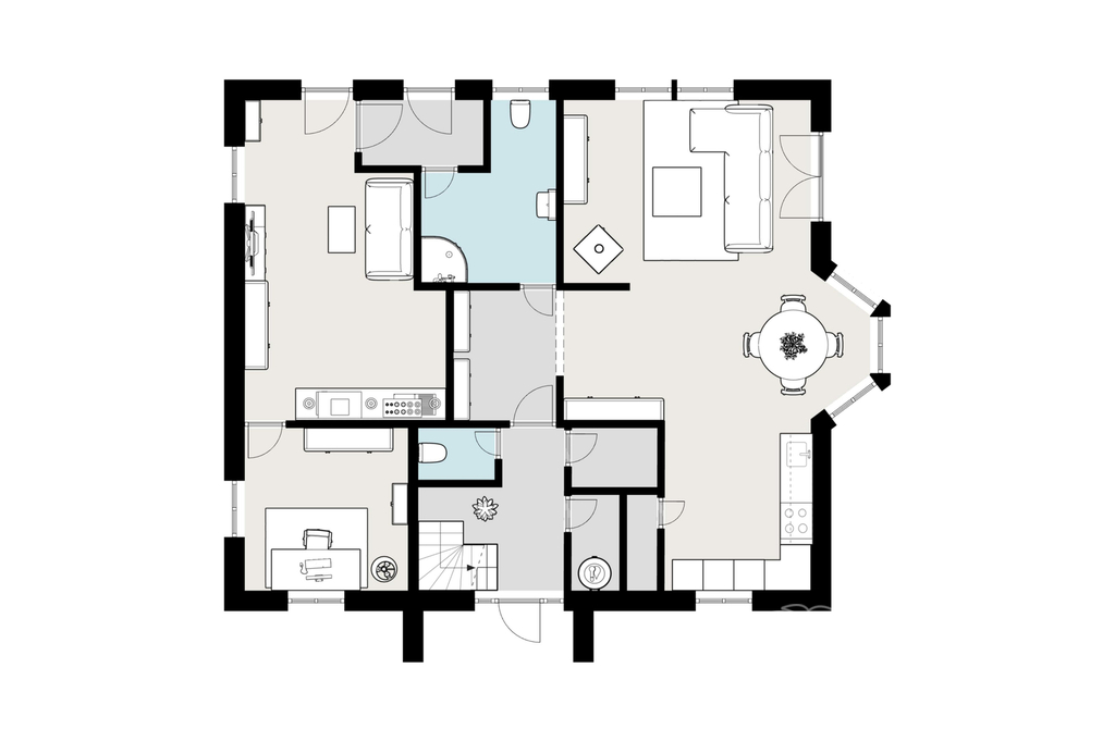Dispozice: 1. NP - vstupní hala se schodištěm, prostorný obývací pokoj s kuchyňským koutem, spíží, krbovými kamny a vstupem na terasu (41 m2), samostatné WC, technická místnost (elektrokotel, akumulační nádrž na teplou vodu), šatna, a dále zádveří druhého vstupu, pokoj s kuchyňským koutem (15 m2), pokoj (10,2 m2), koupelna se sprchovým koutem a WC.