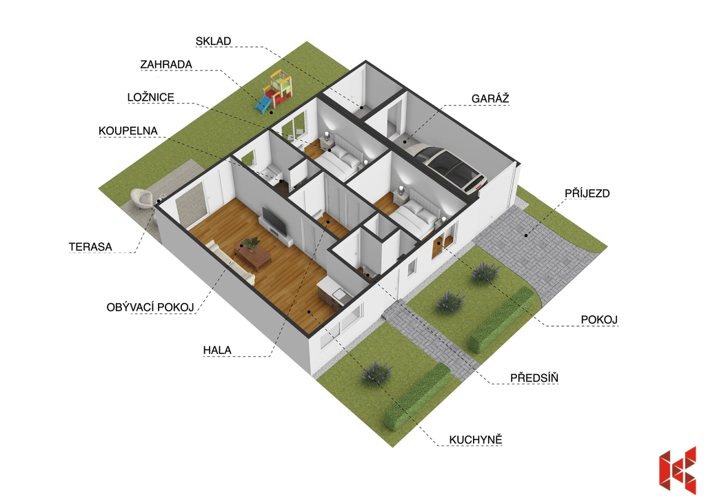 ✔ Dispozici 3+kk s možností úpravy na 4+kk při změně garáže na pokoj