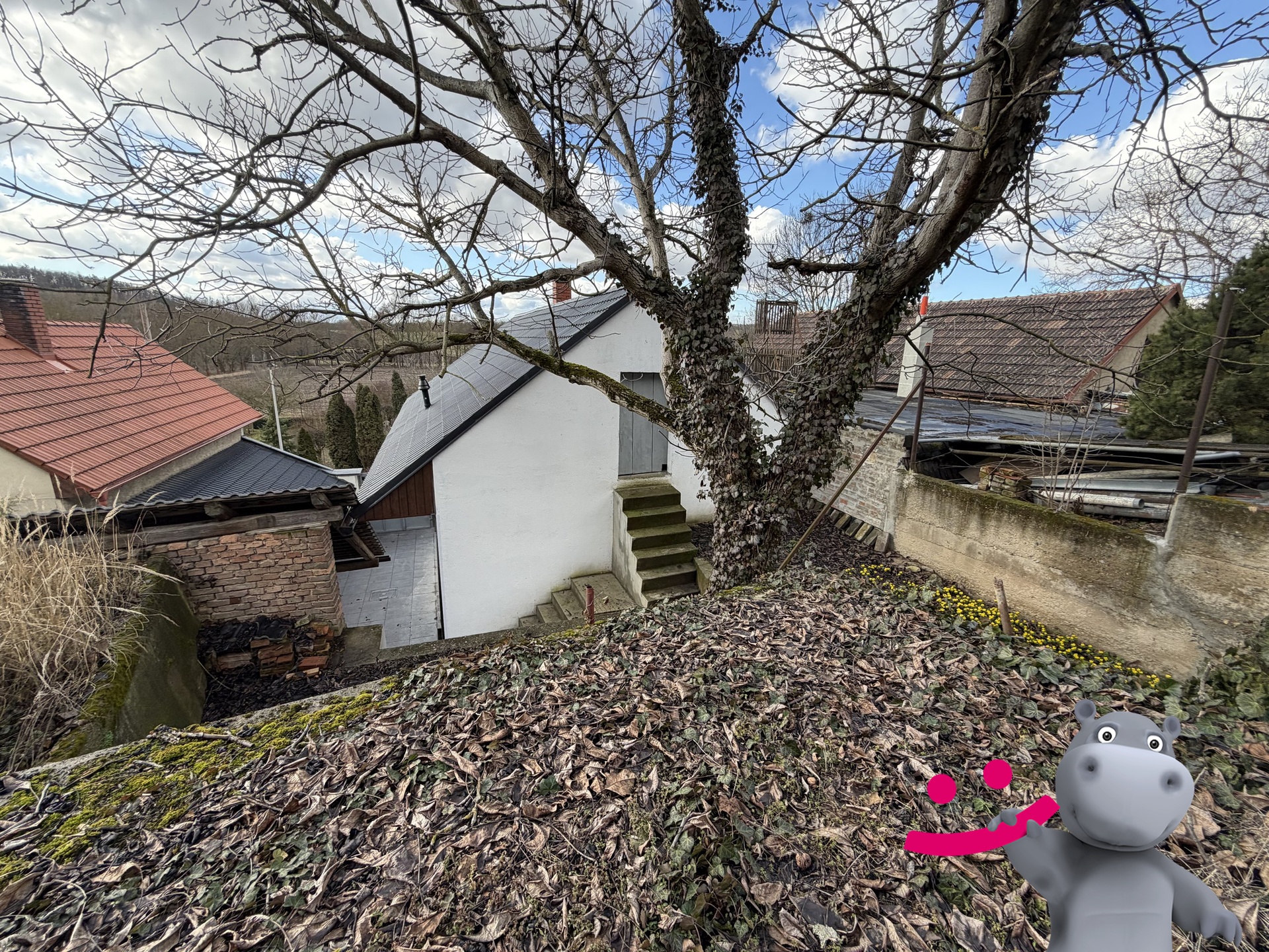 Nad domem se rozprostírá zahrada s ovocnými stromy a vstupem do prostorné půdy – další potenciál pro využití dle vašich představ.